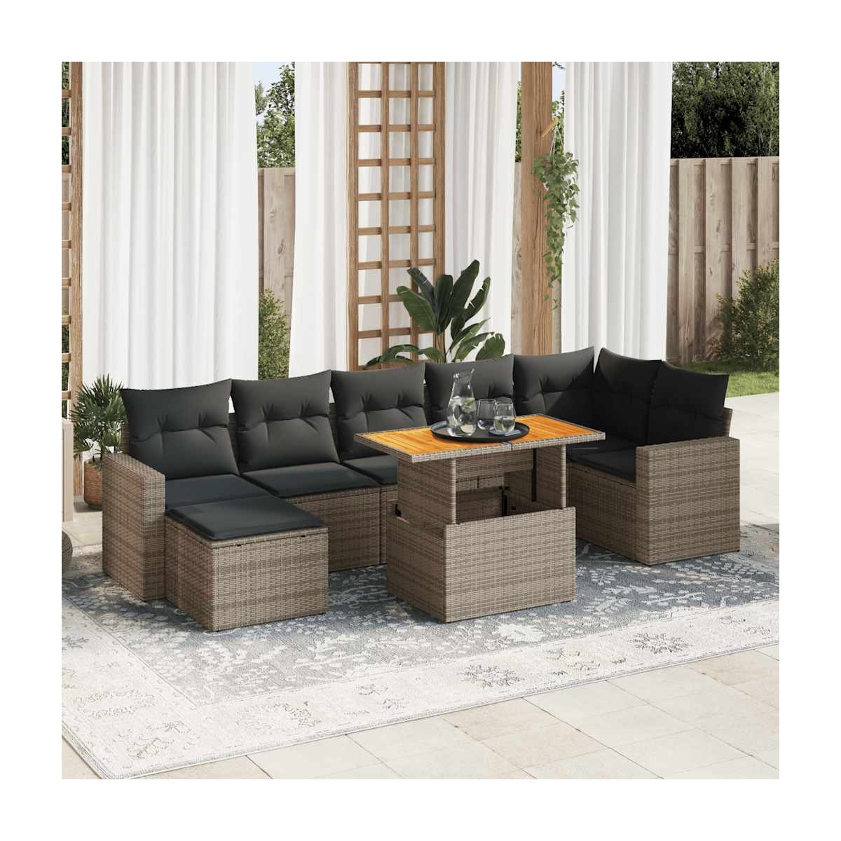 Este conjunto de sofás de jardín es el complemento perfecto para el jardín, terraza o patio, ya que proporciona un espacio confortable y acogedor para charlar con familiares y amigos o simplemente relajarte y disfrutar del aire libre. Material duradero: El ratán sintético, también conocido como ratán sintético, es un material sintético resistente y de bajo mantenimiento que se parece al ratán natural. Es ligero, fácil de limpiar y se usa comúnmente para muebles de exterior debido a su durabilidad y propiedades resistentes a la intemperie.Función de almacenamiento con bolsa resistente al agua: El mueble de jardín cuenta con espacio de almacenamiento debajo del asiento, completo con una bolsa resistente al agua para guardar cojines, juguetes y otros artículos. La bolsa interior se puede sujetar de forma segura a los muebles de exterior con cierres de gancho y bucle para mayor estabilidad.Tablero ajustable: El tablero de la mesa se puede levantar para que la mesa sea más alta, lo que transforma la mesa al aire libre de una mesa de café a una mesa de comedor. Es perfecto para invitar a invitados o comer al aire libre.Funda desenfundable y lavable: Estos cojines de asiento cuentan con fundas desenfundables para facilitar el lavado y mantenimiento.Diseño modular: Este conjunto de muebles de exterior tiene un diseño modular, por lo que es completamente flexible y fácil de mover, para que puedas crear una disposición de muebles de exterior personalizada. Información útil:Para asegurarte de que tus muebles de exterior se mantengan hermosos, recomendamos protegerlos con una funda impermeable.
