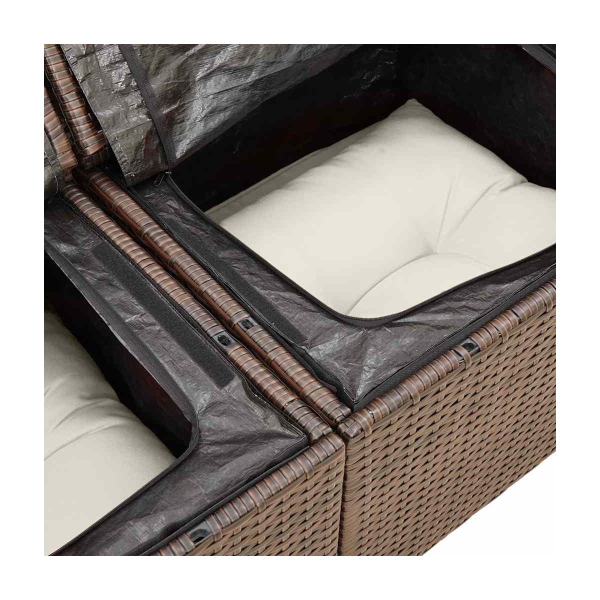 Este conjunto de sofás de jardín es el complemento perfecto para el jardín, terraza o patio, ya que proporciona un espacio confortable y acogedor para charlar con familiares y amigos o simplemente relajarte y disfrutar del aire libre.Material duradero: El ratán sintético, también conocido como ratán sintético, es un material sintético resistente y de bajo mantenimiento que se parece al ratán natural. Es ligero, fácil de limpiar y se usa comúnmente para muebles de exterior debido a su durabilidad y propiedades resistentes a la intemperie.Función de almacenamiento con bolsa resistente al agua: Cada asiento de jardín cuenta con un espacio de almacenamiento debajo del asiento, completo con una bolsa resistente al agua para guardar cojines, juguetes y otros artículos. Las bolsas interiores tienen una cubierta superior y se pueden sujetar de forma segura a los asientos con cierres de gancho y bucle para mayor estabilidad.Funda desenfundable y lavable: Estos cojines de asiento cuentan con fundas desenfundables para facilitar el lavado y mantenimiento.Diseño modular: Este conjunto de muebles de exterior tiene un diseño modular, por lo que es completamente flexible y fácil de mover, para que puedas crear una disposición de muebles de exterior personalizada.Información útil:Para asegurarte de que tus muebles de exterior se mantengan hermosos, recomendamos protegerlos con una funda impermeable.