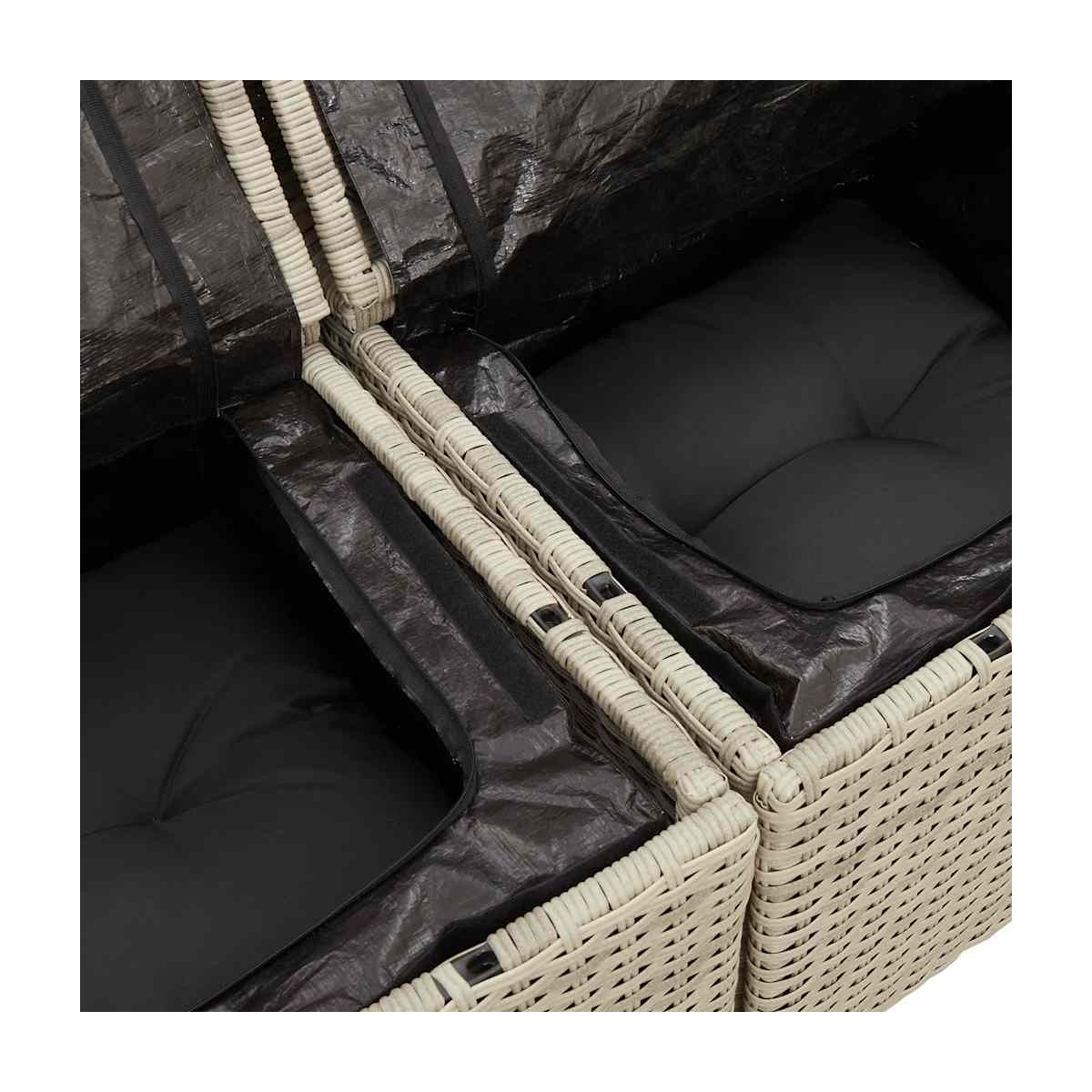 Este conjunto de sofás de jardín es el complemento perfecto para el jardín, terraza o patio, ya que proporciona un espacio confortable y acogedor para charlar con familiares y amigos o simplemente relajarte y disfrutar del aire libre. Material duradero: El ratán sintético, también conocido como ratán sintético, es un material sintético resistente y de bajo mantenimiento que se parece al ratán natural. Es ligero, fácil de limpiar y se usa comúnmente para muebles de exterior debido a su durabilidad y propiedades resistentes a la intemperie.Función de almacenamiento con bolsa resistente al agua: El mueble de jardín cuenta con espacio de almacenamiento debajo del asiento, completo con una bolsa resistente al agua para guardar cojines, juguetes y otros artículos. La bolsa interior se puede sujetar de forma segura a los muebles de exterior con cierres de gancho y bucle para mayor estabilidad.Reposapiés versátil: El taburete es versátil y sirve como un cómodo reposapiés para cuando descanses en el sofá o como asiento adicional en tu jardín.Funda desenfundable y lavable: Estos cojines de asiento cuentan con fundas desenfundables para facilitar el lavado y mantenimiento.Diseño modular: Este conjunto de muebles de exterior tiene un diseño modular, por lo que es completamente flexible y fácil de mover, para que puedas crear una disposición de muebles de exterior personalizada. Información útil:Para asegurarte de que tus muebles de exterior se mantengan hermosos, recomendamos protegerlos con una funda impermeable.