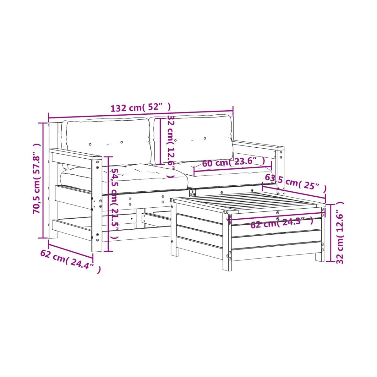 - Dimensiones del reposapiés de jardín: 62 x 63,5 x 32 cm (ancho x profundo x alto)