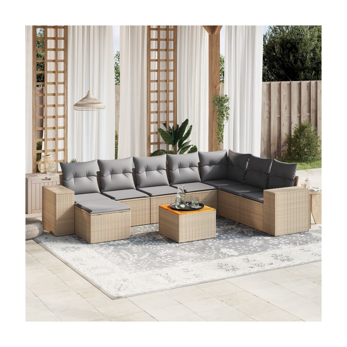 Este conjunto de sofás de jardín es el complemento perfecto para el jardín, terraza o patio, ya que proporciona un espacio confortable y acogedor para charlar con familiares y amigos o simplemente relajarte y disfrutar del aire libre. Material duradero: El ratán PE, también conocido como ratán sintético, es un material sintético resistente y de bajo mantenimiento que se parece al ratán natural. Es ligero, fácil de limpiar y se usa comúnmente para muebles de exterior debido a su durabilidad y propiedades resistentes a la intemperie.Superficie estable y fácil de limpiar: Esta mesa de jardín tiene una superficie de madera de acacia que es resistente, duradero y fácil de limpiar con un paño húmedo. Función de almacenaje con bolsa impermeable: Cada asiento de jardín cuenta con espacio de almacenamiento debajo del asiento, completo con una bolsa resistente al agua para guardar cojines, juguetes y otros artículos. Las bolsas interiores tienen una cubierta superior y pueden fijarse firmemente a los asientos con cierres adhesivos para mayor estabilidad.Experiencia de asiento cómoda: Estos muebles de exterior, completos con cojines acolchados gruesos, ofrecen una experiencia de asiento cómoda.Diseño modular: Este conjunto de muebles de exterior tiene un diseño modular, por lo que es completamente flexible y fácil de mover, para que puedas crear una disposición de muebles de exterior personalizada. Información útil:Para asegurarte de que tus muebles de exterior se mantengan hermosos, recomendamos protegerlos con una funda impermeable.