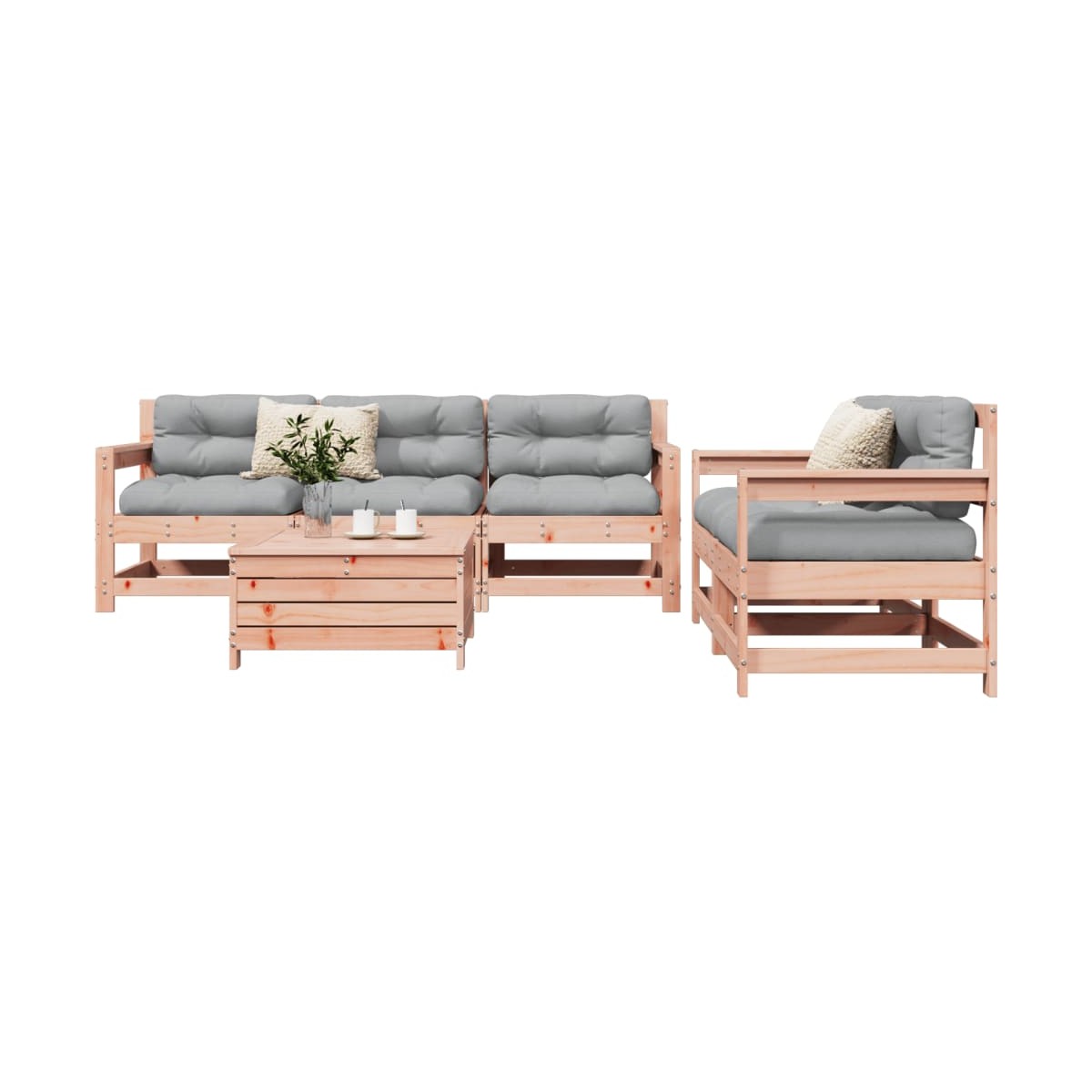 Este juego de sofás de jardín de madera, con un diseño de listones, será un gran complemento para el jardín, el patio o la terraza, para poder disfrutar de un rato agradable con la familia o los amigos. Material resistente y duradero: La madera de abeto Douglas es conocida por su resistencia y durabilidad. Su intenso color marrón rojizo y su veteado único transmiten un ambiente cálido y natural. Con una buena estabilidad y resistencia a la intemperie, es ideal para fabricar muebles de interior y exterior. Buena ventilación y prevención de encharcamientos: El diseño de rejilla favorece un flujo de aire óptimo y evita eficazmente la acumulación de agua, lo que garantiza un asiento seco y cómodo. Uso versátil: El taburete de jardín no solo se puede usar para sentarse o relajar los pies, sino que también se puede usar como mesa de centro para guardar bebidas, comida y otros adornos. Diseño modular: Este conjunto de muebles de exterior tiene un diseño modular, por lo que es completamente flexible y fácil de mover, para que puedas crear una disposición de muebles de exterior personalizada. Información útil:Para asegurarte de que tus muebles de exterior se mantengan hermosos, recomendamos protegerlos con una funda impermeable.
