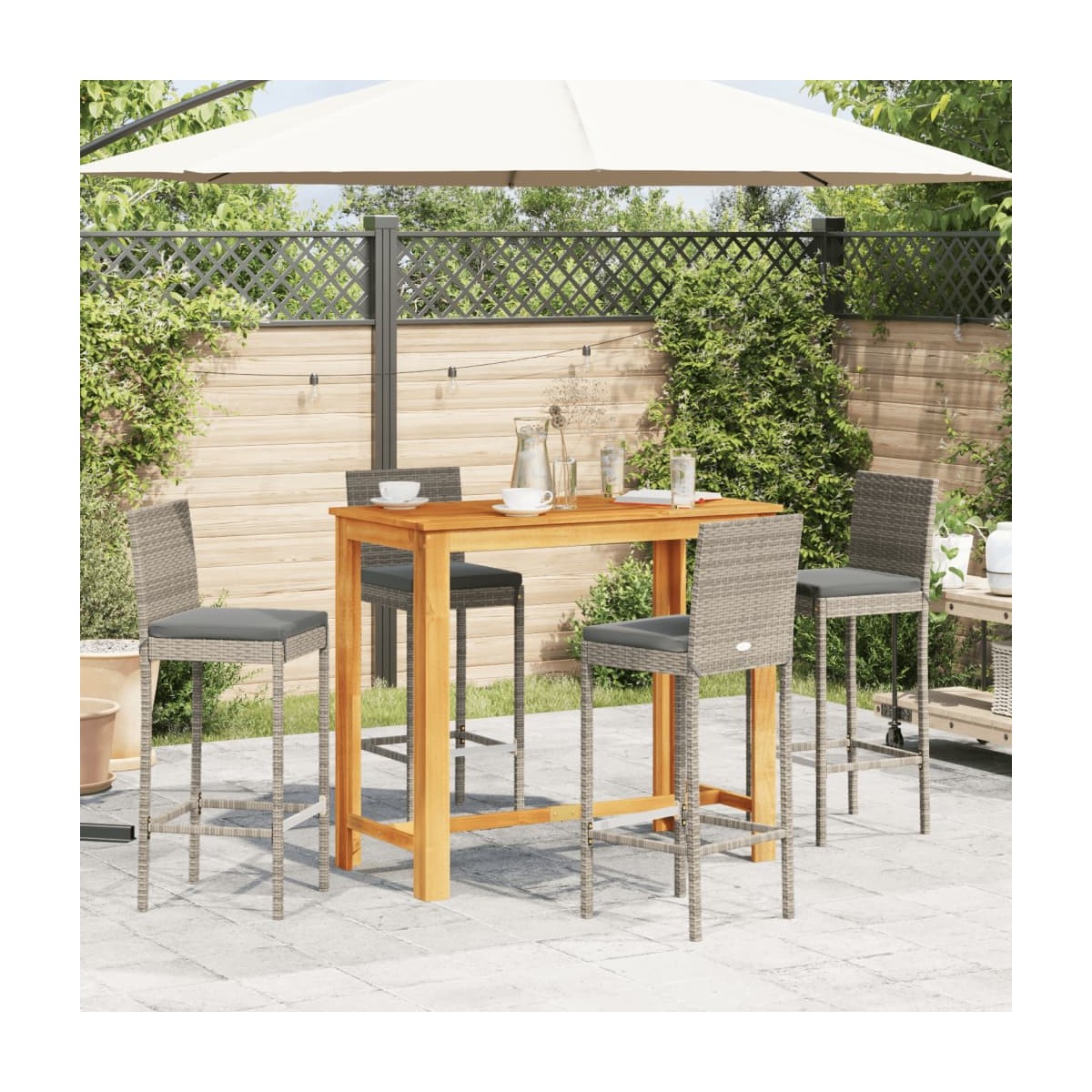 Este juego de mesa y taburetes altos para jardín, con un diseño elegante y moderno, será una excelente opción para comer o relajarse en el jardín. Material duradero: El ratán PE, también conocido como ratán sintético, es un material sintético resistente y de bajo mantenimiento que se parece al ratán natural. Es ligero, fácil de limpiar y se usa comúnmente para muebles de exterior debido a su durabilidad y propiedades resistentes a la intemperie. Hechos de ratán PE ligero, estos taburetes de bar son resistentes y fáciles de mover. Superficie robusta: La madera maciza de acacia es un hermoso material natural. La madera de acacia es una madera dura tropical, densa, robusta y duradera. Hecha de madera maciza de acacia, esta mesa de bar es robusta y estable. Puedes colocar tus aperitivos, bebidas y cualquiera de tus adornos favoritos. Experiencia de asiento cómoda: Los cojines del asiento con acolchado grueso y los reposapiés incorporados aportan comodidad adicional al taburete. Funda desenfundable y lavable: Estos cojines de asiento cuentan con fundas desenfundables para facilitar el lavado y mantenimiento. Información útil:Para asegurarte de que tus muebles de exterior se mantengan hermosos, recomendamos protegerlos con una funda impermeable.