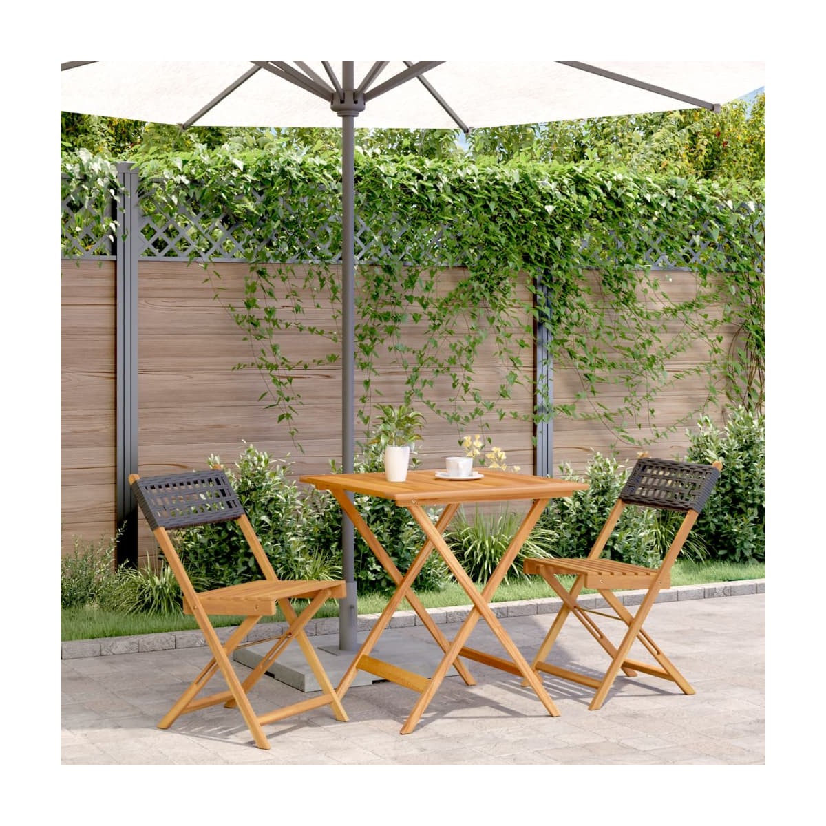 ¡Disfruta de una taza de café o charla con tu familia y amigos en el jardín, el patio o en el balcón con este juego de bistró! Robusta y estable: La madera maciza de acacia es conocida por su resistencia y durabilidad. Sus diversos colores y patrones de vetas únicos le dan una apariencia atractiva. Con buena estabilidad y resistencia a la intemperie, es ideal para fabricar muebles de interior y exterior.Material duradero: El ratán PE, también conocido como ratán sintético, es un material sintético resistente y de bajo mantenimiento que se parece al ratán natural. Es ligero, fácil de limpiar y se usa comúnmente para muebles de exterior debido a su durabilidad y propiedades resistentes a la intemperie.Diseño práctico: La silla de exterior elimina el diseño de reposabrazos y sólo viene con respaldo, lo que te permite tener más libertad de movimiento sin dejar de disfrutar de una experiencia cómoda.Superficie estable: La mesa de exterior ofrece un soporte excelente para bebidas, aperitivos, fruteros y tus adornos favoritos.Diseño plegable: La mesa y las sillas de comedor al aire libre se pueden plegar fácilmente cuando no se utilicen y para facilitar su almacenamiento y transporte. Información útil:Para asegurarte de que tus muebles de exterior se mantengan hermosos, recomendamos protegerlos con una funda impermeable.