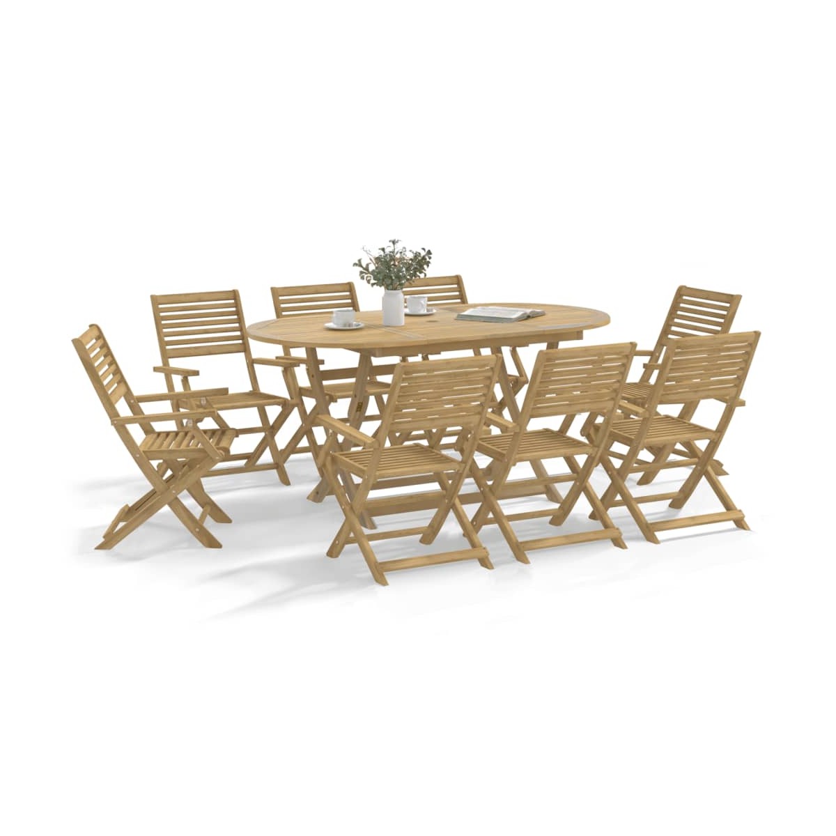¡Disfruta de una buena comida o cena en el espacio al aire libre de tu casa con este juego de comedor de madera para jardín! Madera maciza de acacia: El juego de comedor de exterior está hecho de madera maciza de acacia para mayor robustez y estabilidad. La madera maciza de acacia es un bonito material natural. La madera de acacia tiene una veta recta y los nudos le dan al material su estilo rústico característico.Experiencia de asiento cómoda: Con respaldo, la silla de exterior brinda la máxima comodidad.Diseño de listones: El diseño de listones del juego de comedor de patio evita la acumulación de agua, manteniendo el asiento seco y evitando que se pudra innecesariamente.Superficie estable: La mesa de exterior ofrece un soporte excelente para bebidas, aperitivos, fruteros y tus adornos favoritos.Diseño plegable: La mesa y las sillas de comedor al aire libre se pueden plegar fácilmente cuando no se utilicen y para facilitar su almacenamiento y transporte. Información útil:Para asegurarte de que tus muebles de exterior se mantengan hermosos, recomendamos protegerlos con una funda impermeable.