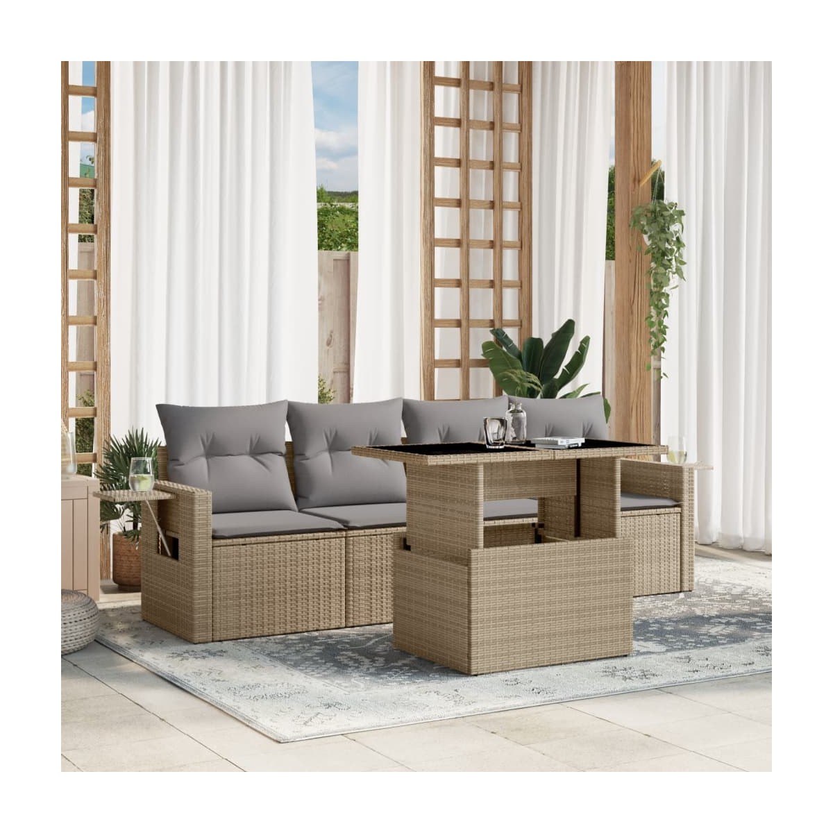 Este conjunto de sofás de jardín es el complemento perfecto para el jardín, terraza o patio, ya que proporciona un espacio confortable y acogedor para charlar con familiares y amigos o simplemente relajarte y disfrutar del aire libre. Material duradero: El ratán PE, también conocido como ratán sintético, es un material sintético resistente y de bajo mantenimiento que se parece al ratán natural. Es ligero, fácil de limpiar y se usa comúnmente para muebles de exterior debido a su durabilidad y propiedades resistentes a la intemperie.Tablero ajustable: El tablero de la mesa se puede levantar para que la mesa sea más alta, lo que transforma la mesa al aire libre de una mesa de café a una mesa de comedor. Es perfecto para invitar a invitados o comer al aire libre.Práctica mesa auxiliar: Este mueble de exterior cuenta con una mesa auxiliar plegable con un resorte de gas en los reposabrazos, lo que proporciona un lugar conveniente para mantener tus elementos esenciales al alcance de la mano. Experiencia de asiento cómoda: Estos muebles de exterior, completos con cojines acolchados gruesos, ofrecen una experiencia de asiento cómoda.Diseño modular: Este conjunto de muebles de exterior tiene un diseño modular, por lo que es completamente flexible y fácil de mover, para que puedas crear una disposición de muebles de exterior personalizada. Información útil:Para asegurarte de que tus muebles de exterior se mantengan hermosos, recomendamos protegerlos con una funda impermeable.