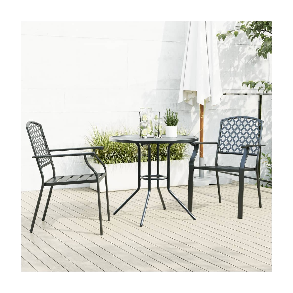 Este juego de sillas de jardín con un aspecto elegante es un aporte llamativo para tu espacio de interior y exterior actual. Acero con recubrimiento en polvo: Este juego de barras de jardín está hecho de acero con recubrimiento en polvo, que es un material excepcionalmente duro y resistente. Ofrece robustez y estabilidad. El recubrimiento en polvo sobre la superficie del acero crea una capa protectora contra el óxido, la corrosión y el desgaste.Diseño práctico: Estas sillas de barra tienen respaldos, que pueden brindarle mayor comodidad, para que puedas sentarte cómodamente en las sillas.Función apilable: El diseño apilable de las sillas ahorra espacio en la habitación.Tablero de malla: El tablero de malla presenta bonitos patrones y es adecuado para colocar bebidas, comida y otros elementos esenciales.Amplias aplicaciones: Este juego de sillas de exterior multifuncionales presenta una forma perfecta para adaptarse a cualquier ambiente de la casa. Se puede utilizar en la cocina, comedor, sala de estar, patio, etc.