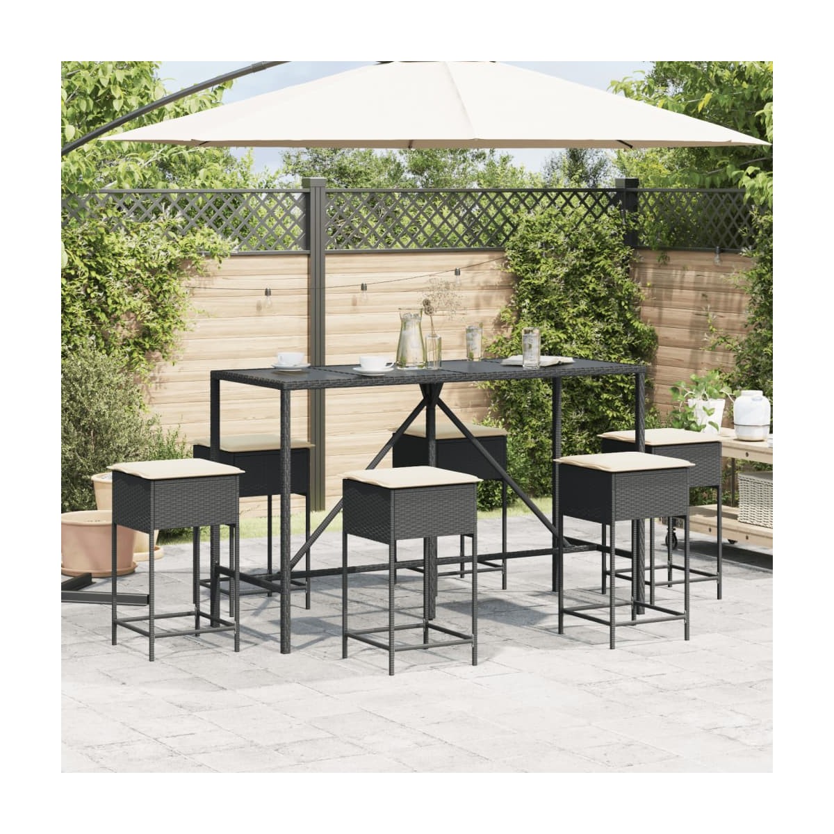 Este juego de bar de jardín de moda, que combina estilo y funcionalidad, seguramente está destinado a ser la pieza central de tu jardín, patio y cualquier otro espacio. Material duradero: El ratán PE, también conocido como ratán sintético, es un material sintético resistente y de bajo mantenimiento que se parece al ratán natural. Es ligero, fácil de limpiar y se usa comúnmente para muebles de exterior debido a su durabilidad y propiedades resistentes a la intemperie.Experiencia de asiento cómoda: Estos muebles de exterior, completos con cojines acolchados gruesos, ofrecen una experiencia de asiento cómoda.Funda desenfundable y lavable: Estos cojines de asiento cuentan con fundas desenfundables para facilitar el lavado y mantenimiento.Superficie de vidrio: La superficie de la mesa de exterior es de vidrio templado resistente y duradero, por lo que es fácil de limpiar con un paño húmedo y añade un toque de elegancia a tu espacio exterior.Estructura robusta y estable: La estructura de acero con recubrimiento en polvo garantiza que el mueble de jardín sea resistente y estable para usarlo a diario al aire libre. Información útil:Para asegurarte de que tus muebles de exterior se mantengan hermosos, recomendamos protegerlos con una funda impermeable.