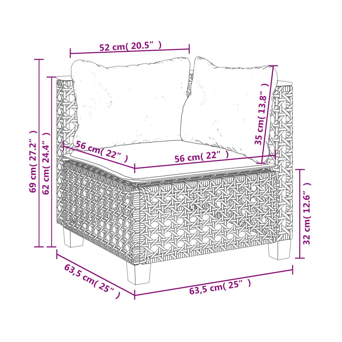 - Dimensiones del cojín del asiento (esquina): 56,5 x 56,5 x 3 cm (ancho x profundo x grosor)