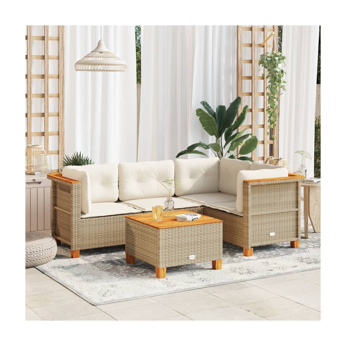 - Material: Ratán PE, acero con recubrimiento en polvo, madera maciza de acacia con acabado de aceite natural