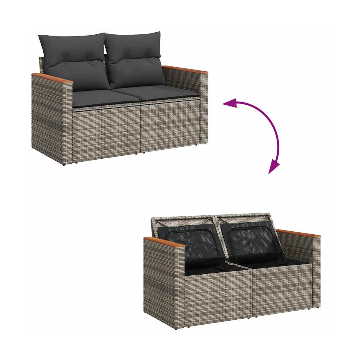 Este conjunto de sofás de jardín es el complemento perfecto para el jardín, terraza o patio, ya que proporciona un espacio confortable y acogedor para charlar con familiares y amigos o simplemente relajarte y disfrutar del aire libre. Material duradero: El ratán sintético, también conocido como ratán sintético, es un material sintético resistente y de bajo mantenimiento que se parece al ratán natural. Es ligero, fácil de limpiar y se usa comúnmente para muebles de exterior debido a su durabilidad y propiedades resistentes a la intemperie.Función de almacenamiento con bolsa resistente al agua: El mueble de jardín cuenta con espacio de almacenamiento debajo del asiento, completo con una bolsa resistente al agua para guardar cojines, juguetes y otros artículos. La bolsa interior se puede sujetar de forma segura a los muebles de exterior con cierres de gancho y bucle para mayor estabilidad.Reposapiés versátil: El taburete es versátil y sirve como un cómodo reposapiés para cuando descanses en el sofá o como asiento adicional en tu jardín.Funda desenfundable y lavable: Estos cojines de asiento cuentan con fundas desenfundables para facilitar el lavado y mantenimiento.Diseño modular: Este conjunto de muebles de exterior tiene un diseño modular, por lo que es completamente flexible y fácil de mover, para que puedas crear una disposición de muebles de exterior personalizada. Información útil:Para asegurarte de que tus muebles de exterior se mantengan hermosos, recomendamos protegerlos con una funda impermeable.