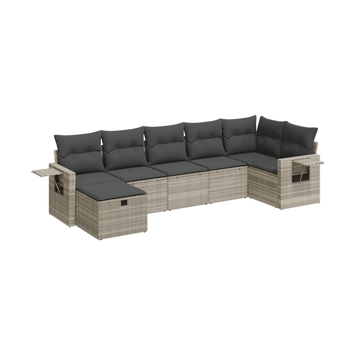 Este conjunto de sofás de jardín es el complemento perfecto para el jardín, terraza o patio, ya que proporciona un espacio confortable y acogedor para charlar con familiares y amigos o simplemente relajarte y disfrutar del aire libre. Material duradero: El ratán sintético, también conocido como ratán sintético, es un material sintético resistente y de bajo mantenimiento que se parece al ratán natural. Es ligero, fácil de limpiar y se usa comúnmente para muebles de exterior debido a su durabilidad y propiedades resistentes a la intemperie.Función de almacenamiento con bolsa resistente al agua: El mueble de jardín cuenta con espacio de almacenamiento debajo del asiento, completo con una bolsa resistente al agua para guardar cojines, juguetes y otros artículos. La bolsa interior se puede sujetar de forma segura a los muebles de exterior con cierres de gancho y bucle para mayor estabilidad.Reposapiés versátil: El taburete es versátil y sirve como un cómodo reposapiés para cuando descanses en el sofá o como asiento adicional en tu jardín.Funda desenfundable y lavable: Estos cojines de asiento cuentan con fundas desenfundables para facilitar el lavado y mantenimiento.Diseño modular: Este conjunto de muebles de exterior tiene un diseño modular, por lo que es completamente flexible y fácil de mover, para que puedas crear una disposición de muebles de exterior personalizada. Información útil:Para asegurarte de que tus muebles de exterior se mantengan hermosos, recomendamos protegerlos con una funda impermeable.