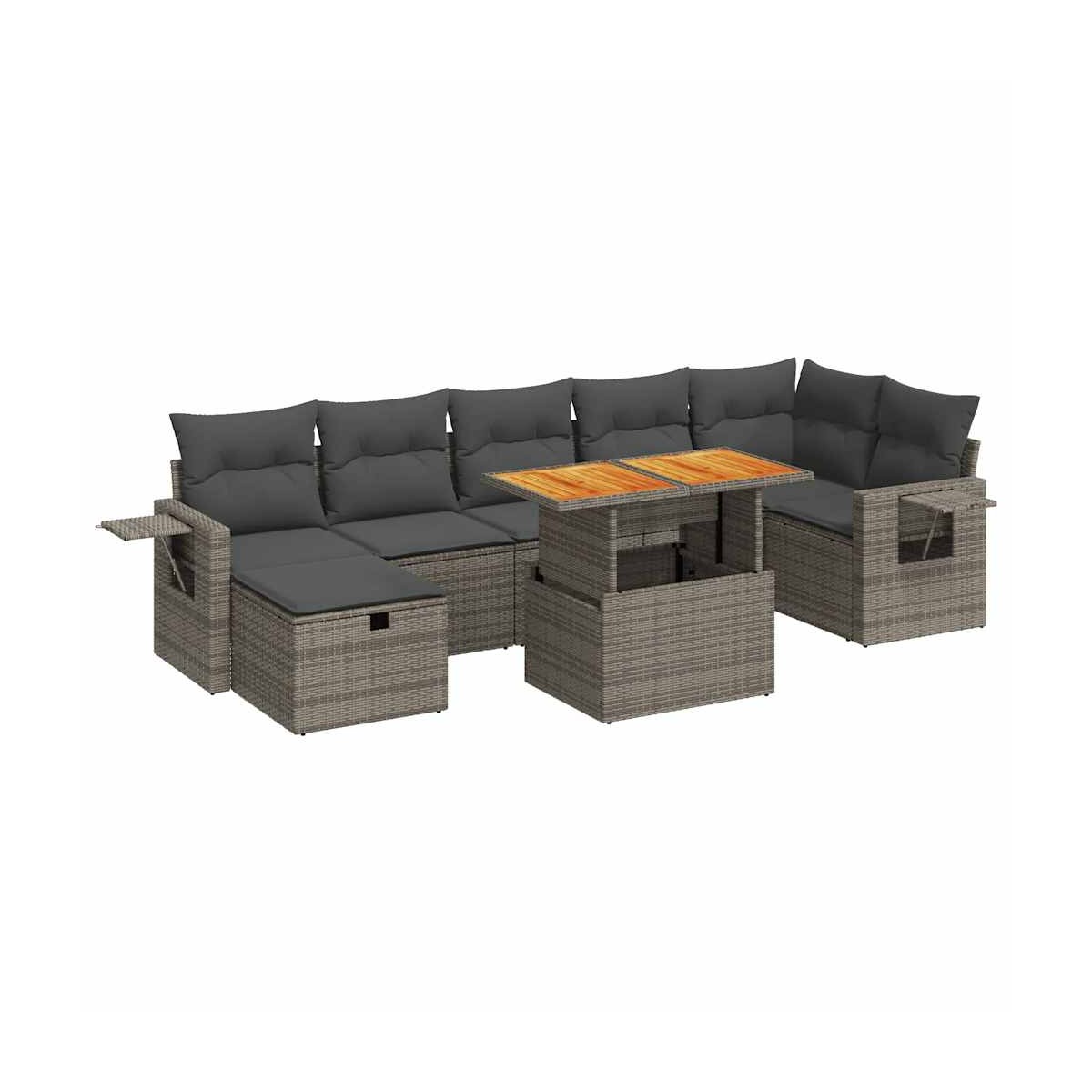Este conjunto de sofás de jardín es el complemento perfecto para el jardín, terraza o patio, ya que proporciona un espacio confortable y acogedor para charlar con familiares y amigos o simplemente relajarte y disfrutar del aire libre.Material duradero: El ratán sintético, también conocido como ratán sintético, es un material sintético resistente y de bajo mantenimiento que se parece al ratán natural. Es ligero, fácil de limpiar y se usa comúnmente para muebles de exterior debido a su durabilidad y propiedades resistentes a la intemperie.Función de almacenamiento con bolsa resistente al agua: Cada asiento de jardín cuenta con un espacio de almacenamiento debajo del asiento, completo con una bolsa resistente al agua para guardar cojines, juguetes y otros artículos. Las bolsas interiores tienen una cubierta superior y se pueden sujetar de forma segura a los asientos con cierres de gancho y bucle para mayor estabilidad.Cómoda mesa auxiliar: Este mueble de exterior cuenta con una mesa auxiliar plegable con un muelle de gas, lo que proporciona un lugar práctico para mantener tus elementos esenciales al alcance de la mano.Funda desenfundable y lavable: Estos cojines de asiento cuentan con fundas desenfundables para facilitar el lavado y mantenimiento.Diseño modular: Este conjunto de muebles de exterior tiene un diseño modular, por lo que es completamente flexible y fácil de mover, para que puedas crear una disposición de muebles de exterior personalizada.Información útil:Para asegurarte de que tus muebles de exterior se mantengan hermosos, recomendamos protegerlos con una funda impermeable.