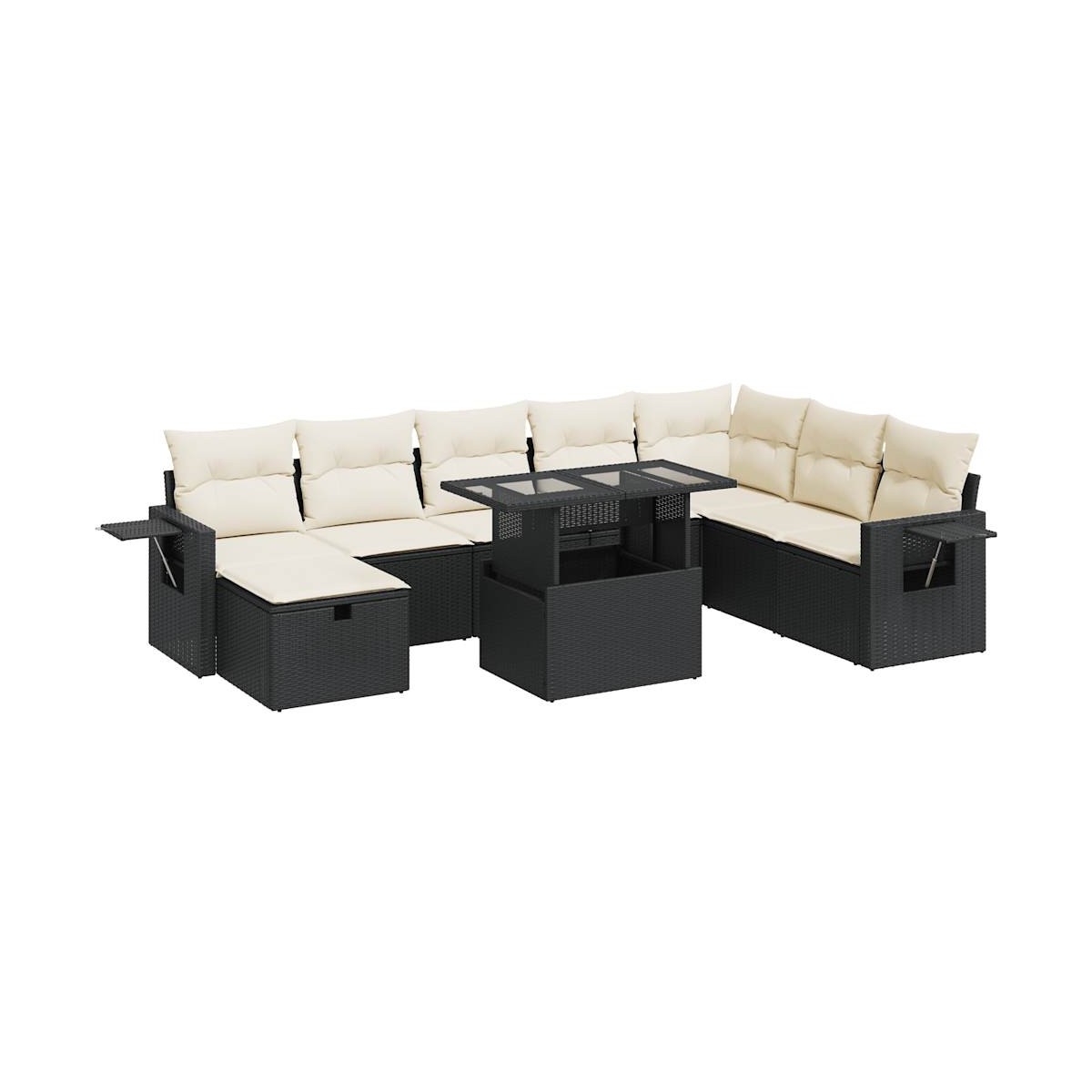 Este conjunto de sofás de jardín es el complemento perfecto para el jardín, terraza o patio, ya que proporciona un espacio confortable y acogedor para charlar con familiares y amigos o simplemente relajarte y disfrutar del aire libre.Material duradero: El ratán sintético, también conocido como ratán sintético, es un material sintético resistente y de bajo mantenimiento que se parece al ratán natural. Es ligero, fácil de limpiar y se usa comúnmente para muebles de exterior debido a su durabilidad y propiedades resistentes a la intemperie.Función de almacenamiento con bolsa resistente al agua: Cada asiento de jardín cuenta con un espacio de almacenamiento debajo del asiento, completo con una bolsa resistente al agua para guardar cojines, juguetes y otros artículos. Las bolsas interiores tienen una cubierta superior y se pueden sujetar de forma segura a los asientos con cierres de gancho y bucle para mayor estabilidad.Cómoda mesa auxiliar: Este mueble de exterior cuenta con una mesa auxiliar plegable con un muelle de gas, lo que proporciona un lugar práctico para mantener tus elementos esenciales al alcance de la mano.Funda desenfundable y lavable: Estos cojines de asiento cuentan con fundas desenfundables para facilitar el lavado y mantenimiento.Diseño modular: Este conjunto de muebles de exterior tiene un diseño modular, por lo que es completamente flexible y fácil de mover, para que puedas crear una disposición de muebles de exterior personalizada.Información útil:Para asegurarte de que tus muebles de exterior se mantengan hermosos, recomendamos protegerlos con una funda impermeable.