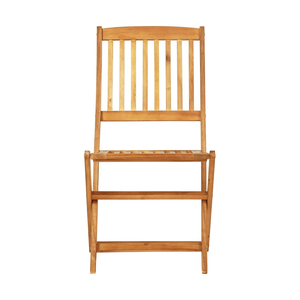 ¡Disfruta de tu tiempo libre con la familia y los amigos alrededor de este juego de muebles de jardín de madera! Material de primera calidad: La madera maciza de acacia es un bonito material natural. La madera de acacia es una madera dura tropical, densa, robusta y duradera.Diseño plegable: El juego de exterior se puede plegar para moverla y transportarlo fácilmente. Puedes guardarlo ocupando menos espacio cuando no lo uses.Superficie práctica: La superficie estable de la mesa de bistró es ideal para colocar la bebida o cualquier otra cosa que necesites a mano. Un lado de la mesa es recto para poder colocarla contra la pared.Experiencia de asiento cómoda: Con respaldo, la silla de exterior brinda la máxima comodidad.Superficie fácil de limpiar: La superficie con acabado de aceite hace que esta mesa plegable sea fácil de limpiar con un paño húmedo.Muchos usos: El juego tiene un diseño atemporal y se adapta a casi cualquier decoración. Puedes colocarlo en casa o en cualquier patio comercial, jardín, balcón, etc. Información útil:Para asegurarte de que tus muebles de exterior se mantengan hermosos, recomendamos protegerlos con una funda impermeable.