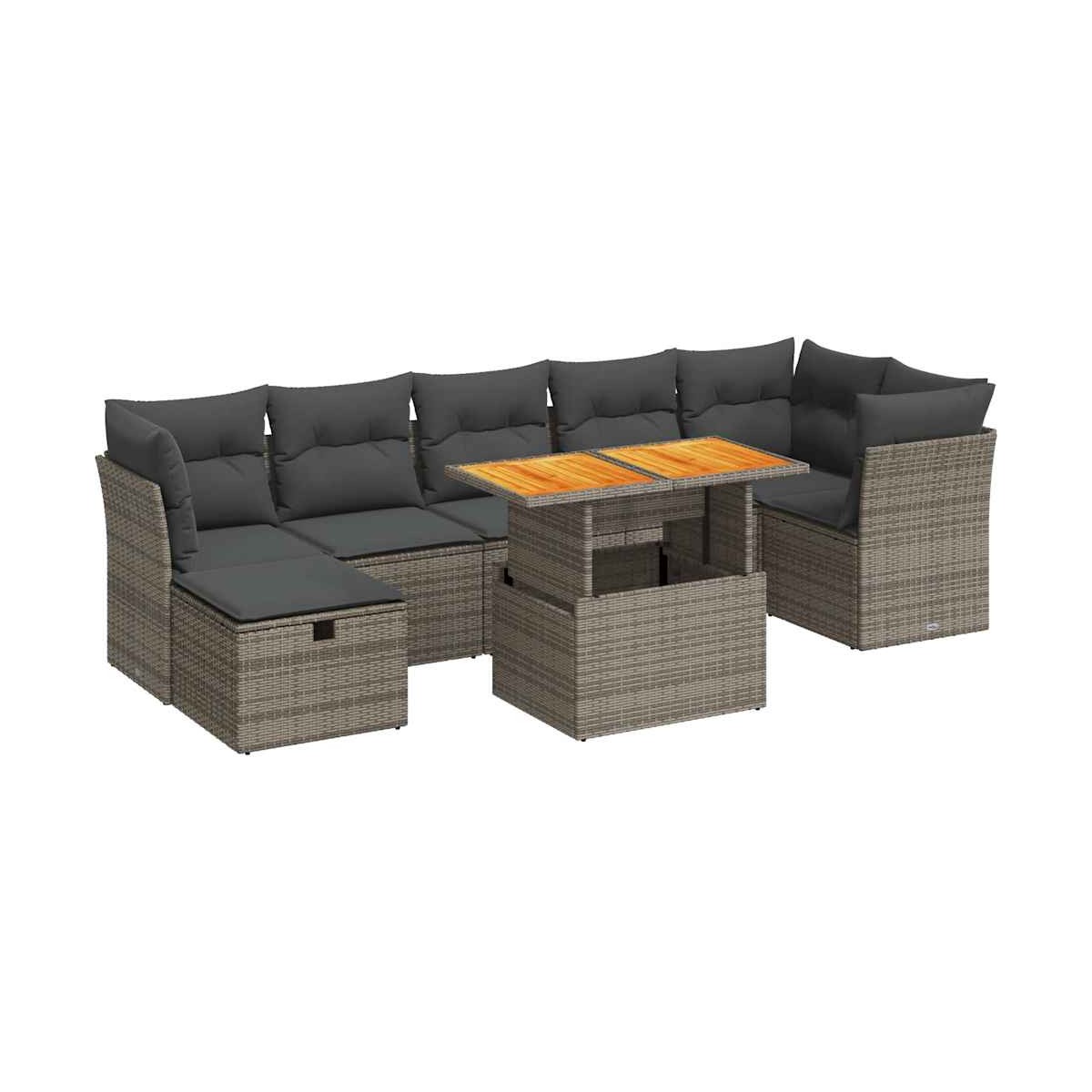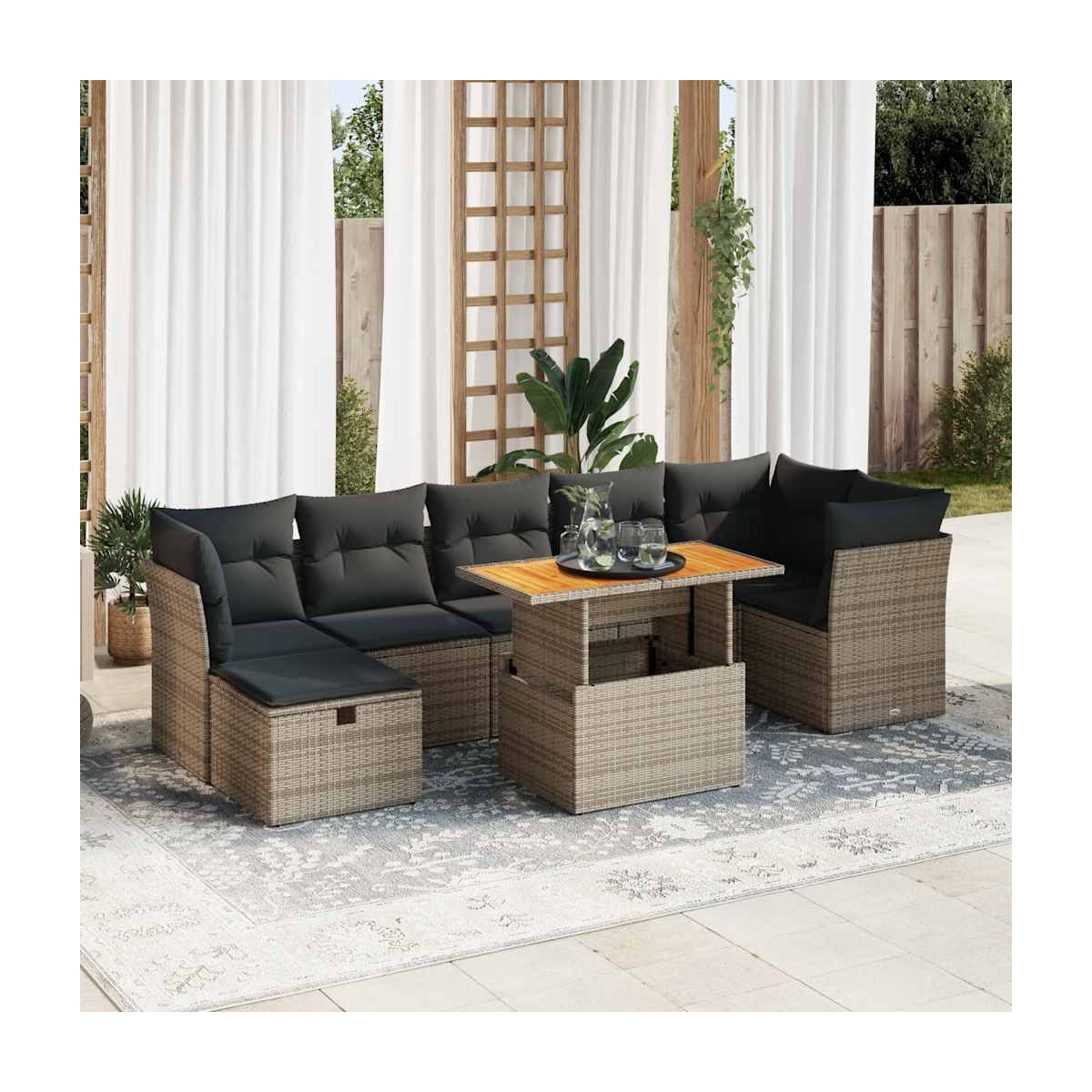 Este conjunto de sofás de jardín es el complemento perfecto para el jardín, terraza o patio, ya que proporciona un espacio confortable y acogedor para charlar con familiares y amigos o simplemente relajarte y disfrutar del aire libre.Material duradero: El ratán sintético, también conocido como ratán sintético, es un material sintético resistente y de bajo mantenimiento que se parece al ratán natural. Es ligero, fácil de limpiar y se usa comúnmente para muebles de exterior debido a su durabilidad y propiedades resistentes a la intemperie.Función de almacenamiento con bolsa resistente al agua: Cada asiento de jardín cuenta con un espacio de almacenamiento debajo del asiento, completo con una bolsa resistente al agua para guardar cojines, juguetes y otros artículos. Las bolsas interiores tienen una cubierta superior y se pueden sujetar de forma segura a los asientos con cierres de gancho y bucle para mayor estabilidad.Funda desenfundable y lavable: Estos cojines de asiento cuentan con fundas desenfundables para facilitar el lavado y mantenimiento.Diseño modular: Este conjunto de muebles de exterior tiene un diseño modular, por lo que es completamente flexible y fácil de mover, para que puedas crear una disposición de muebles de exterior personalizada.Información útil:Para asegurarte de que tus muebles de exterior se mantengan hermosos, recomendamos protegerlos con una funda impermeable.