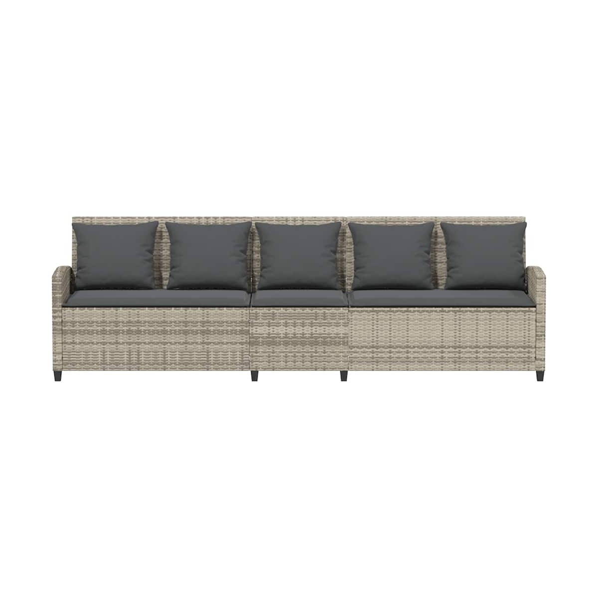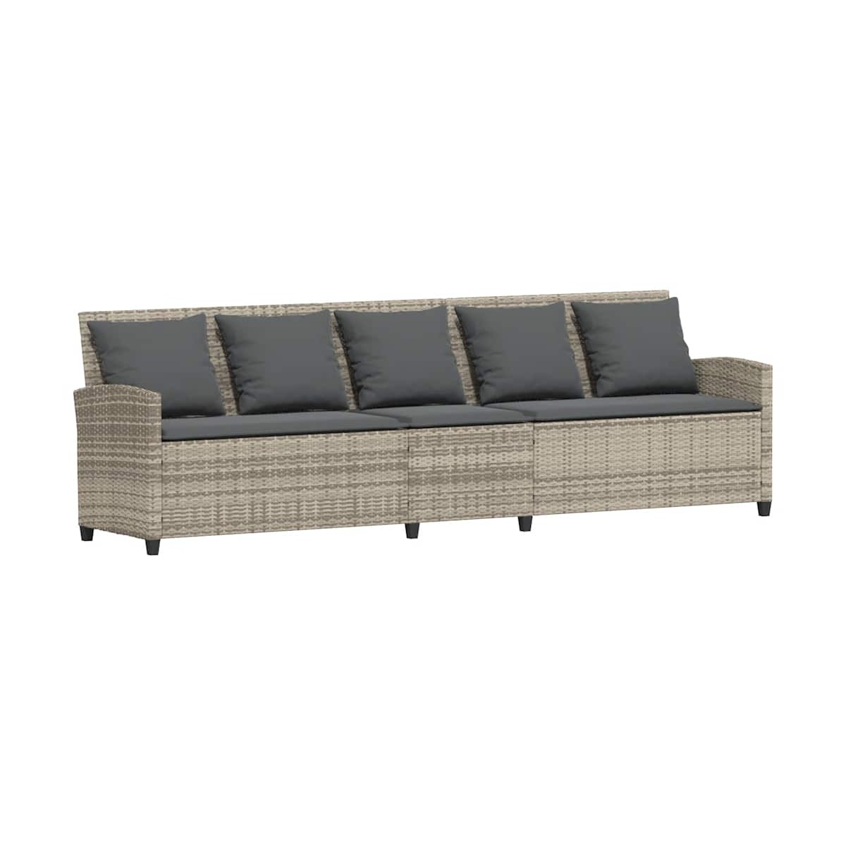 ¡Relájate y disfruta del aire libre en este cómodo sofá de jardín de 5 plazas! Material duradero: El ratán sintético, también conocido como ratán sintético, es un material sintético resistente y de bajo mantenimiento que se parece al ratán natural. Es ligero, fácil de limpiar y se usa comúnmente para muebles de exterior debido a su durabilidad y propiedades resistentes a la intemperie.Experiencia de asiento cómoda: Estos muebles de exterior, completos con cojines acolchados gruesos, ofrecen una experiencia de asiento cómoda.Funda extraíble y lavable: Estos cojines y almohadas de asiento cuentan con fundas extraíbles para facilitar el lavado y el mantenimiento.Estructura robusta y estable: La estructura de acero con recubrimiento en polvo garantiza que el mueble de jardín sea resistente y estable para usarlo a diario al aire libre. Información útil:Para asegurarte de que tus muebles de exterior se mantengan hermosos, recomendamos protegerlos con una funda impermeable.