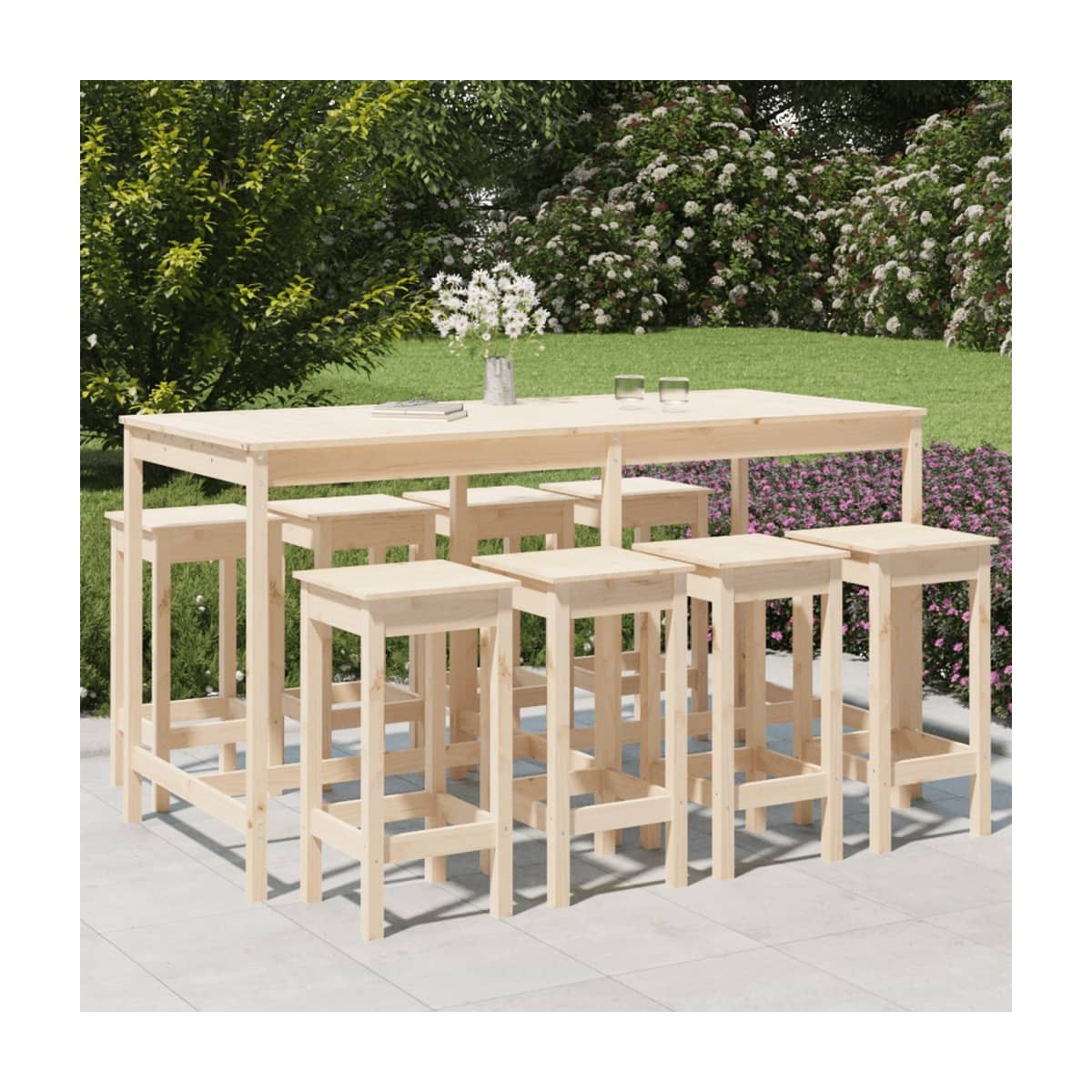 ¡Toma un sorbo de tu bebida favorita o disfruta de una buena comida con la familia y los amigos alrededor de este juego de mesa y taburetes altos de madera! Madera maciza de pino: Este juego de mesa y taburetes altos está hecho de madera maciza de pino. La madera maciza de pino es un bonito material natural. La madera de pino tiene vetas rectas, y los nudos dan al material su distintivo aspecto rústico.Superficie resistente: La mesa alta de estos muebles de bar tiene una superficie resistente, perfecta para colocar bebidas, comida y artículos decorativos.Diseño práctico: Estos taburetes altos de madera no tienen respaldo, para que te puedas sentar cómodamente por cualquier lado de los taburetes y para que puedas guardarlos debajo de la encimera cuando no se usen.Amplios usos: Con un diseño minimalista, el juego de muebles altos para jardín encaja en cualquier rincón del jardín, patio, balcón, la terraza, etc. Nota:Para asegurarte de que tus muebles de exterior se mantengan hermosos, recomendamos protegerlos con una funda impermeable.