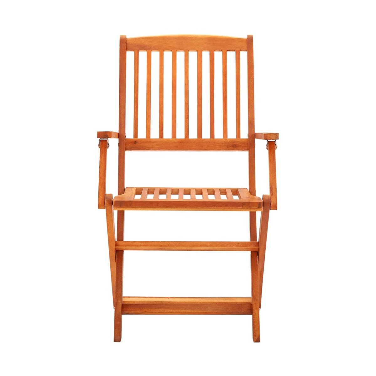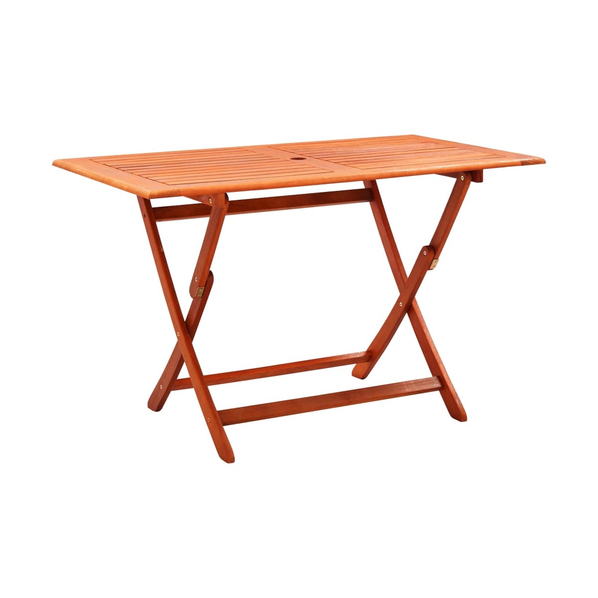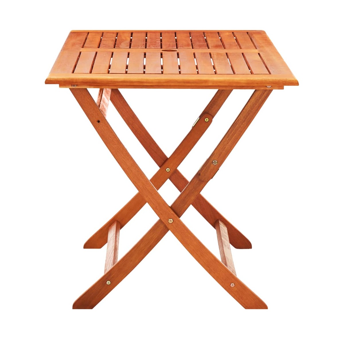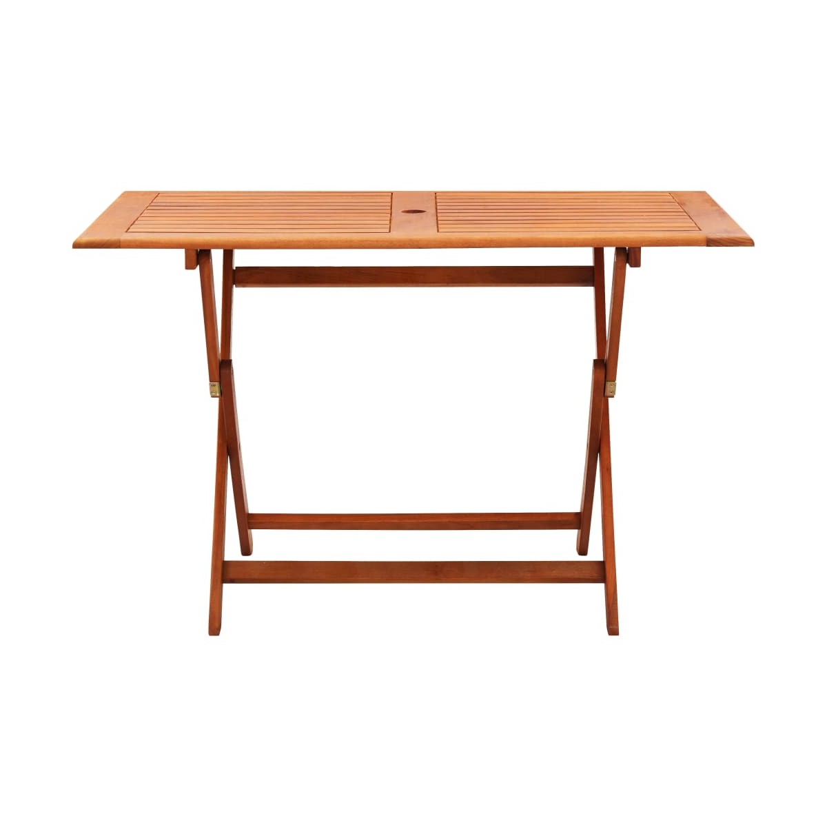 Este juego de comedor plegable de madera para exterior tiene un diseño rústico y atemporal y será una excelente opción para cenar en el jardín o en el patio.El juego de comedor está hecho de madera de eucalipto, resistente a la intemperie y duradera durante años. La superficie con acabado de aceite es fácil de limpiar con un paño húmedo. Además, la mesa tiene un agujero en el centro para poner una sombrilla. La mesa y las sillas se pueden plegar para ahorrar espacio cuando no están en uso. Nota: Para prolongar la vida útil de los muebles de exterior, te recomendamos que los limpies con regularidad y no los dejes al aire libre sin protección innecesariamente.Limpiar: Usa una solución de jabón suaveAlmacenamiento: Si es posible, guarda el producto en un lugar fresco y seco en el interior. Si el producto se almacena al aire libre, protégelo con una funda impermeable. Limpia y seca el exceso de agua o nieve de las superficies planas después de una lluvia o nevada. Permite la ventilación para evitar daños relacionados con la humedad.