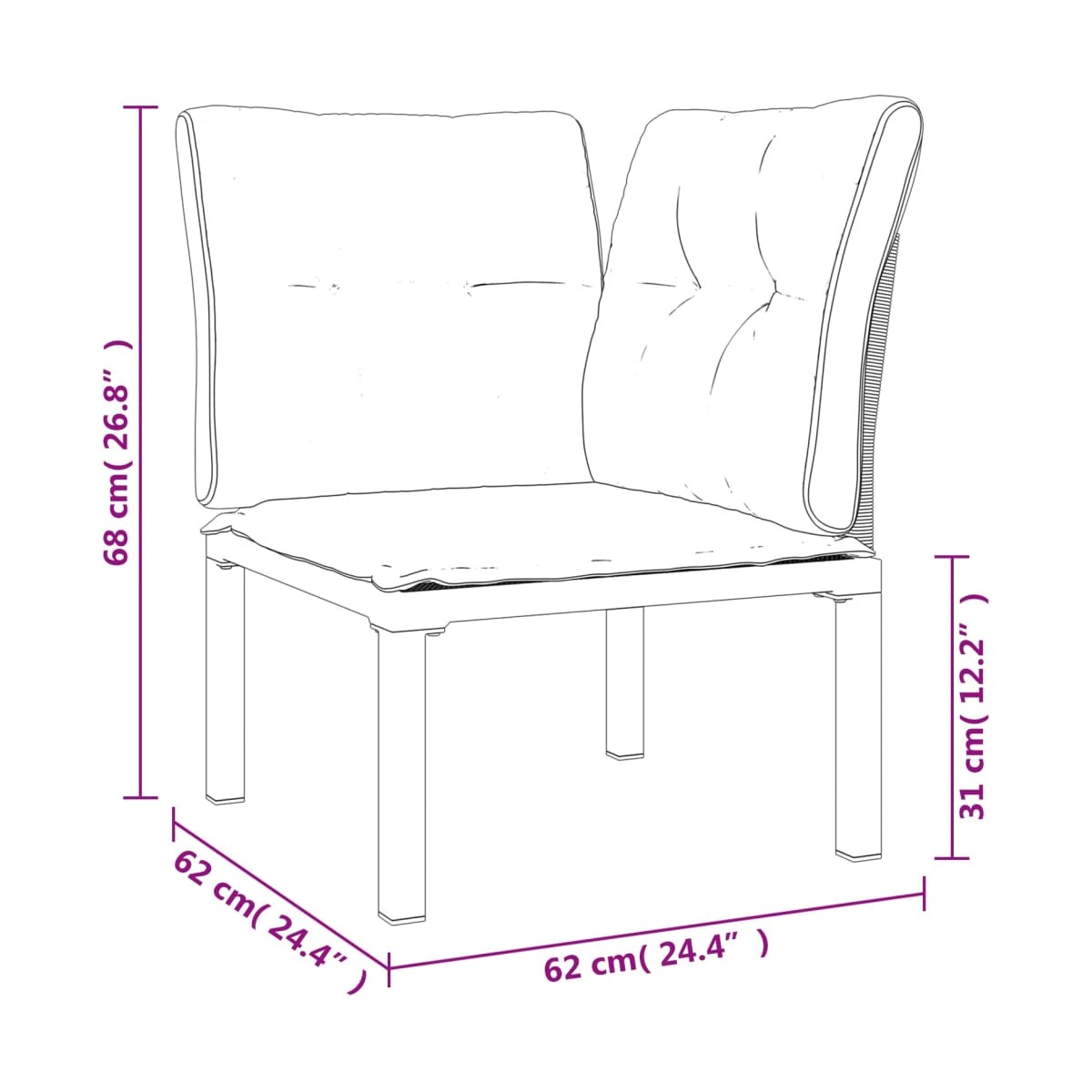 Este elegante conjunto de muebles de jardín presenta un diseño elegante y moderno, que es una gran opción para relajarse en el jardín. Material resistente a la intemperie: El ratán PE, también conocido como ratán sintético, es resistente a la intemperie y fácil de limpiar. La parte exterior se mantiene hermosa durante mucho tiempo. Ofrece una gran calidad, comodidad y aspecto estético. Estructura robusta y estable: La estructura de acero con recubrimiento en polvo del juego de muebles garantiza su solidez y estabilidad.Cómodo asiento: El respaldo aporta un plus de comodidad al sentarse. Además, los cojines gruesos y acolchados proporcionan comodidad al asiento.Diseño modular: El juego de muebles para exteriores es flexible y fácil de mover, por lo que puedes combinarlo con otros segmentos modulares de la tienda web para crear tus propias configuraciones personales de muebles de jardín.Mesa práctica: La robusta superficie de la mesa de centro para jardín es perfecta para colocar comidas, bebidas y artículos decorativos. Información útil:Para facilitar al máximo el montaje, cada producto se entrega con un manual.Nota:Para asegurarte de que tus muebles de exterior se mantengan hermosos, recomendamos protegerlos con una funda impermeable.
