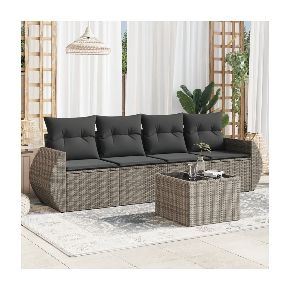 Este conjunto de sofás de jardín es el complemento perfecto para el jardín, terraza o patio, ya que proporciona un espacio confortable y acogedor para charlar con familiares y amigos o simplemente relajarte y disfrutar del aire libre. Material duradero: El ratán de PE, también conocido como ratán sintético, es un material sintético resistente y de bajo mantenimiento que se parece al ratán natural. Es ligero, fácil de limpiar y se usa comúnmente para muebles de exterior debido a su durabilidad y propiedades resistentes a la intemperie.Superficie de vidrio: La superficie de la mesa de exterior es de vidrio templado resistente y duradero, por lo que es fácil de limpiar con un paño húmedo y añade un toque de elegancia a tu espacio exterior. Experiencia de asiento cómoda: Estos muebles de exterior, completos con cojines acolchados gruesos, ofrecen una experiencia de asiento cómoda. Funda desenfundable y lavable: Estos cojines de asiento cuentan con fundas desenfundables para facilitar el lavado y mantenimiento.Diseño modular: Este conjunto de muebles de exterior tiene un diseño modular, por lo que es completamente flexible y fácil de mover, para que puedas crear una disposición de muebles de exterior personalizada. Información útil:Para asegurarte de que tus muebles de exterior se mantengan hermosos, recomendamos protegerlos con una funda impermeable.