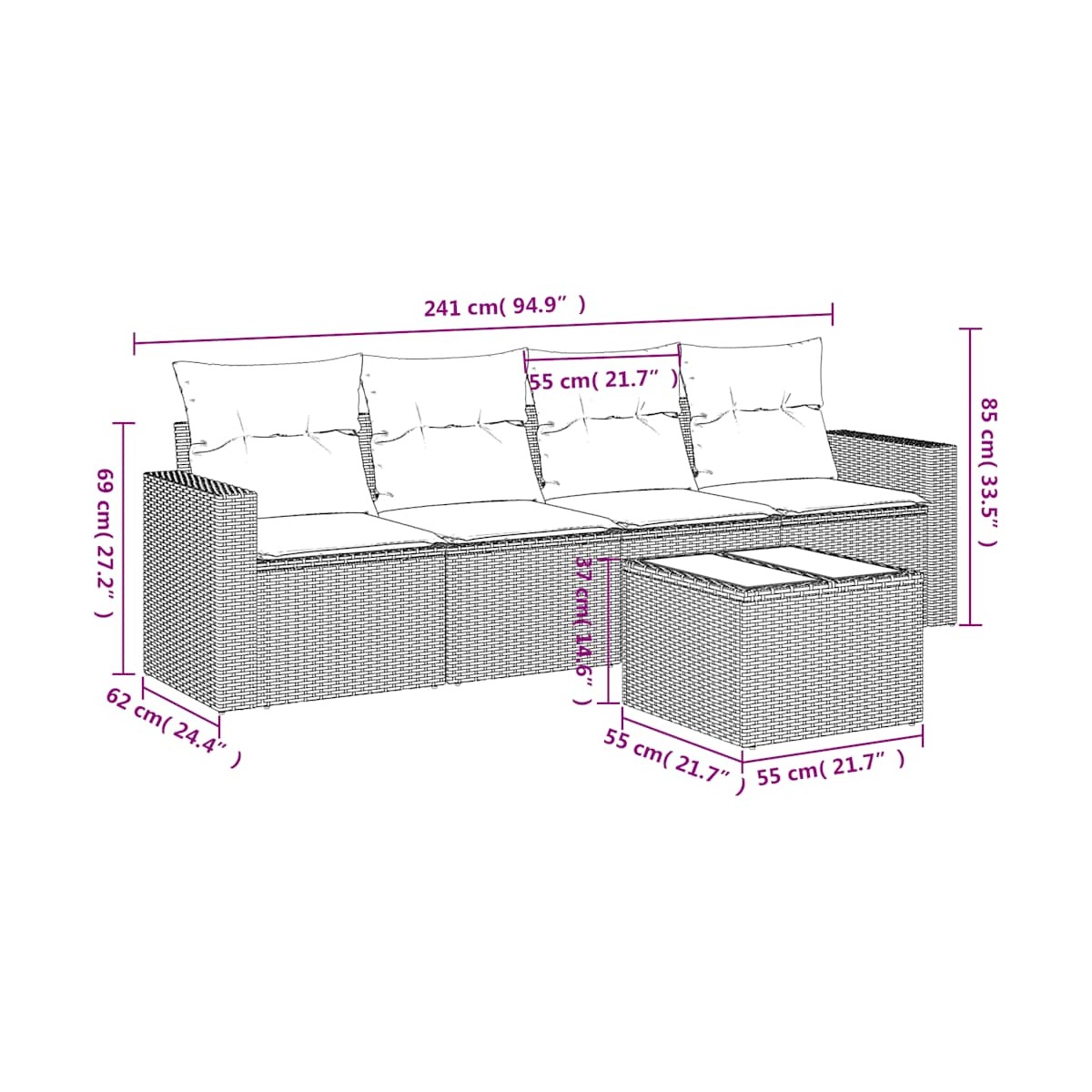 - Dimensiones del cojín de asiento: 55 x 55 x 3 cm (ancho x profundo x grosor)
