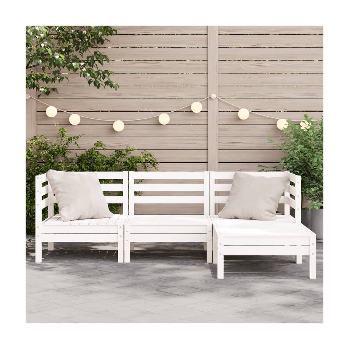 Este sofá de madera de 3 plazas con reposapiés será un buen aporte para el jardín, la terraza o el patio, para charlar con familiares y amigos o simplemente disfrutar del buen tiempo. Madera maciza de pino: La madera maciza de pino es un bonito material natural. La madera de pino tiene vetas rectas y los nudos dan al material su característico aspecto rústico. Hecho de madera maciza de pino, el sofá de exterior es duradero y estable.Cómodo asiento: El respaldo añade un plus de comodidad al asiento de jardín.Uso versátil: Este taburete de exterior no solo se puede usar para sentarse o descansar los pies, sino que también se puede utilizar como mesa de centro para colocar bebidas, comida y adornos.Diseño de listones: El diseño de listones del sofá de palés evita que el agua se acumule de forma eficaz, para que el asiento permanezca seco y no se pudra.Diseño modular: El sofá de jardín de madera tiene un diseño modular que lo hace completamente flexible y fácil de mover para adaptarlo a cualquier entorno. ¡Puedes combinarlo con otros segmentos modulares disponibles en el menú desplegable para crear tus propias configuraciones de muebles de jardín! Información útil:Para asegurarte de que tus muebles de exterior se mantengan hermosos, recomendamos protegerlos con una funda impermeable.