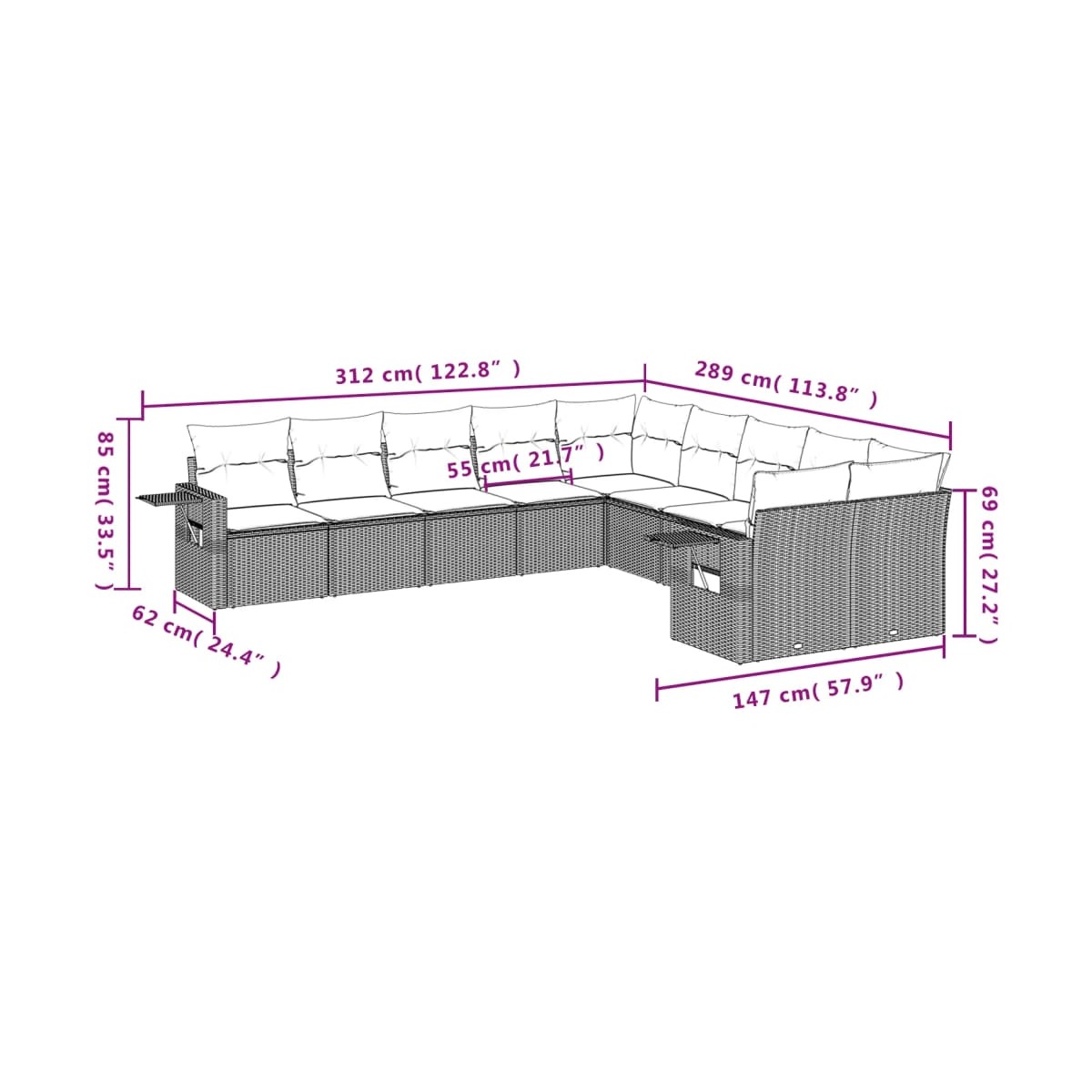 - Dimensiones del cojín de respaldo: 55 x 45 x 13 cm (largo x ancho x profundo)