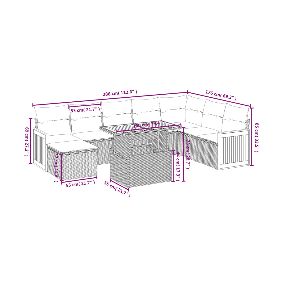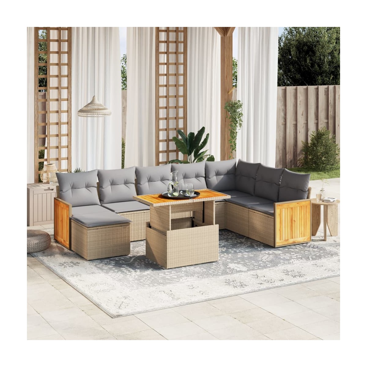 Este conjunto de sofás de jardín es el complemento perfecto para el jardín, terraza o patio, ya que proporciona un espacio confortable y acogedor para charlar con familiares y amigos o simplemente relajarte y disfrutar del aire libre. Material duradero: El ratán PE, también conocido como ratán sintético, es un material sintético resistente y de bajo mantenimiento que se parece al ratán natural. Es ligero, fácil de limpiar y se usa comúnmente para muebles de exterior debido a su durabilidad y propiedades resistentes a la intemperie.Tablero ajustable: El tablero de la mesa se puede levantar para que la mesa sea más alta, lo que transforma la mesa de jardín de una mesa de centro a una mesa de comedor. Es perfecta para invitar a invitados o comer al aire libre.Funda desenfundable y lavable: Estos cojines de asiento cuentan con fundas desenfundables para facilitar el lavado y mantenimiento.Diseño modular: Este conjunto de muebles de exterior tiene un diseño modular, por lo que es completamente flexible y fácil de mover, para que puedas crear una disposición de muebles de exterior personalizada. Información útil:Para asegurarte de que tus muebles de exterior se mantengan hermosos, recomendamos protegerlos con una funda impermeable.