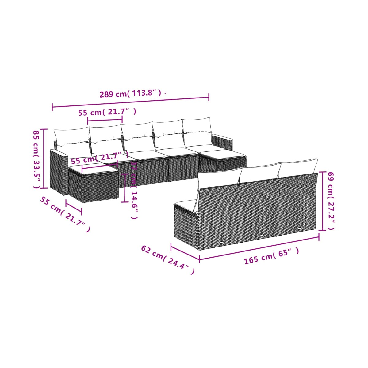 - Dimensiones del cojín de asiento: 55 x 55 x 3 cm (ancho x profundo x grosor)