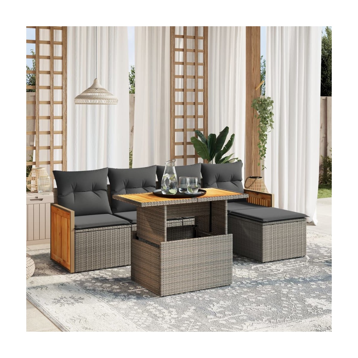 Este conjunto de sofás de jardín es el complemento perfecto para el jardín, terraza o patio, ya que proporciona un espacio confortable y acogedor para charlar con familiares y amigos o simplemente relajarte y disfrutar del aire libre. Material duradero: El ratán PE, también conocido como ratán sintético, es un material sintético resistente y de bajo mantenimiento que se parece al ratán natural. Es ligero, fácil de limpiar y se usa comúnmente para muebles de exterior debido a su durabilidad y propiedades resistentes a la intemperie.Tablero ajustable: El tablero de la mesa se puede levantar para que la mesa sea más alta, lo que transforma la mesa de jardín de una mesa de centro a una mesa de comedor. Es perfecta para invitar a invitados o comer al aire libre.Funda desenfundable y lavable: Estos cojines de asiento cuentan con fundas desenfundables para facilitar el lavado y mantenimiento.Diseño modular: Este conjunto de muebles de exterior tiene un diseño modular, por lo que es completamente flexible y fácil de mover, para que puedas crear una disposición de muebles de exterior personalizada. Información útil:Para asegurarte de que tus muebles de exterior se mantengan hermosos, recomendamos protegerlos con una funda impermeable.
