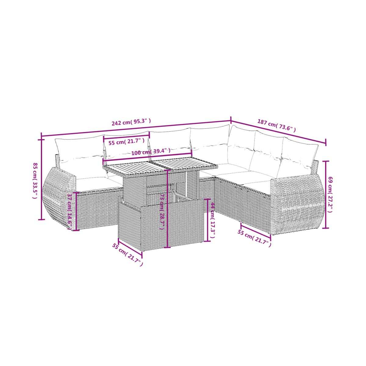 Este conjunto de sofás de jardín es el complemento perfecto para el jardín, terraza o patio, ya que proporciona un espacio confortable y acogedor para charlar con familiares y amigos o simplemente relajarte y disfrutar del aire libre. Material duradero: El ratán PE, también conocido como ratán sintético, es un material sintético resistente y de bajo mantenimiento que se parece al ratán natural. Es ligero, fácil de limpiar y se usa comúnmente para muebles de exterior debido a su durabilidad y propiedades resistentes a la intemperie.Tablero ajustable: El tablero de la mesa se puede levantar para que la mesa sea más alta, lo que transforma la mesa de jardín de una mesa de centro a una mesa de comedor. Es perfecta para invitar a invitados o comer al aire libre.Experiencia de asiento cómoda: Estos muebles de exterior, completos con cojines acolchados gruesos, ofrecen una experiencia de asiento cómoda.Funda desenfundable y lavable: Estos cojines de asiento cuentan con fundas desenfundables para facilitar el lavado y mantenimiento.Diseño modular: Este conjunto de muebles de exterior tiene un diseño modular, por lo que es completamente flexible y fácil de mover, para que puedas crear una disposición de muebles de exterior personalizada. Información útil:Para asegurarte de que tus muebles de exterior se mantengan hermosos, recomendamos protegerlos con una funda impermeable.