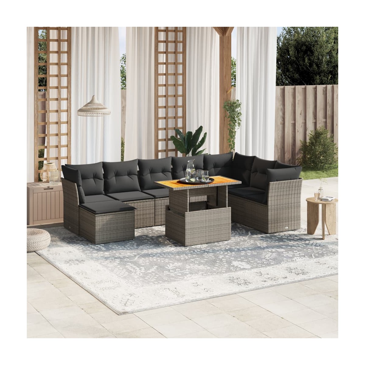 Este conjunto de sofás de jardín es el complemento perfecto para el jardín, terraza o patio, ya que proporciona un espacio confortable y acogedor para charlar con familiares y amigos o simplemente relajarte y disfrutar del aire libre. Material duradero: El ratán PE, también conocido como ratán sintético, es un material sintético resistente y de bajo mantenimiento que se parece al ratán natural. Es ligero, fácil de limpiar y se usa comúnmente para muebles de exterior debido a su durabilidad y propiedades resistentes a la intemperie.Tablero ajustable: El tablero de la mesa se puede levantar para que la mesa sea más alta, lo que transforma la mesa de jardín de una mesa de centro a una mesa de comedor. Es perfecta para invitar a invitados o comer al aire libre.Experiencia de asiento cómoda: Estos muebles de exterior, completos con cojines acolchados gruesos, ofrecen una experiencia de asiento cómoda.Funda desenfundable y lavable: Estos cojines de asiento cuentan con fundas desenfundables para facilitar el lavado y mantenimiento.Diseño modular: Este conjunto de muebles de exterior tiene un diseño modular, por lo que es completamente flexible y fácil de mover, para que puedas crear una disposición de muebles de exterior personalizada. Información útil:Para asegurarte de que tus muebles de exterior se mantengan hermosos, recomendamos protegerlos con una funda impermeable.