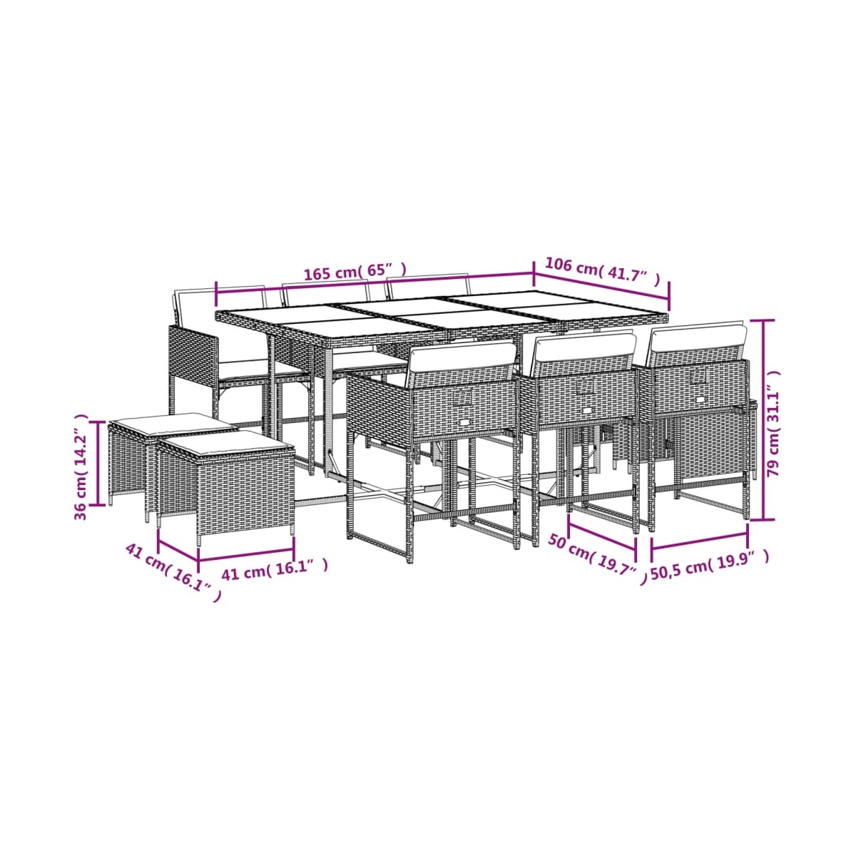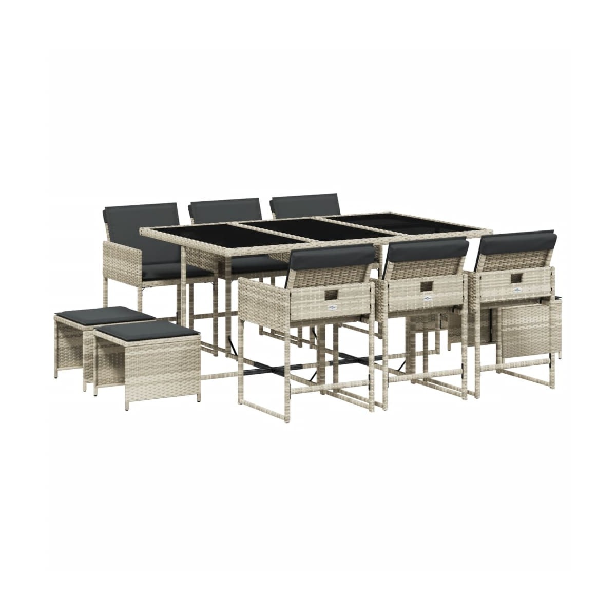 Este juego de comedor de jardín es una gran elección para comer al aire libre o simplemente para relajarte en el jardín, el patio o la terraza. Material duradero: El ratán PE, también conocido como ratán sintético, es un material sintético resistente y de bajo mantenimiento que se parece al ratán natural. Es ligero, fácil de limpiar y se usa comúnmente para muebles de exterior debido a su durabilidad y propiedades resistentes a la intemperie.Almacenamiento compacto: Estas sillas tienen un respaldo con solapa que se puede plegar, lo que facilita guardarlas debajo de la mesa. Cuando están plegadas, caben perfectamente debajo de la mesa, formando un cubo que ahorra espacio. Además, los taburetes también se pueden guardar debajo de las sillas, maximizando aún más la eficiencia del espacio.Experiencia de asiento cómoda: Estos muebles de exterior, completos con cojines acolchados gruesos, ofrecen una experiencia de asiento cómoda.Funda extraíble y lavable: Estos cojines de asiento cuentan con fundas desenfundables para facilitar el lavado y mantenimiento. Las fundas de los cojines poseen una solapa trasera que permite adherirlas fácilmente a los respaldos.Superficie de vidrio: La superficie de la mesa de exterior es de vidrio templado resistente y duradero, por lo que es fácil de limpiar con un paño húmedo y añade un toque de elegancia a tu espacio exterior. Información útil: Para asegurarte de que tus muebles de exterior se mantengan hermosos, recomendamos protegerlos con una funda impermeable.