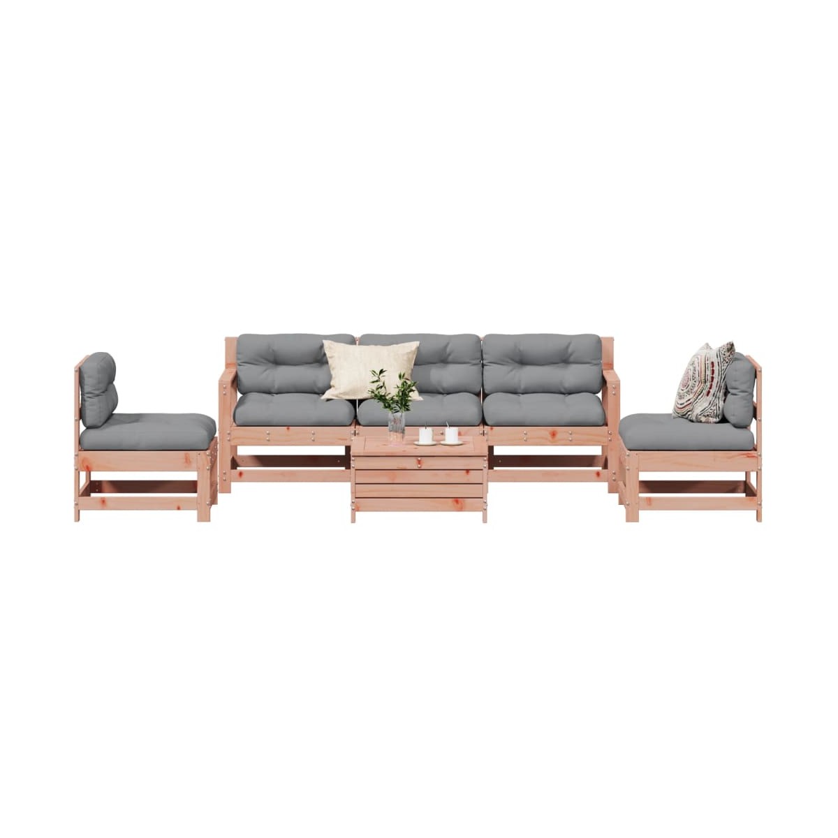 Este juego de sofás de jardín de madera, con un diseño de listones, será un gran complemento para el jardín, el patio o la terraza, para poder disfrutar de un rato agradable con la familia o los amigos. Madera maciza de abeto douglas: La madera maciza de abeto douglas es madera muy duradera que funciona bien para exteriores. La madera de pino douglas también es lo bastante fuerte para trabajar con el mínimo cuidado, incluso bajo la influencia del clima.Diseño de listones: El diseño de listones de la silla de jardín de madera evita la acumulación de agua, manteniendo el asiento seco y evitando que se pudra innecesariamente.Cómodo asiento: El respaldo y el reposabrazos aportan un plus de comodidad al juego de muebles de jardín. Además, el cojín grueso y acolchado proporciona comodidad al asiento.Uso versátil: La otomana de exterior con tapa no solo se puede usar para sentarse o relajar los pies, sino que también se puede usar como mesa de centro para poner las bebidas y la comida. El mueble de jardín cuentan con espacio de almacenamiento debajo del asiento. Diseño modular: Este conjunto de muebles de exterior tiene un diseño modular, por lo que es completamente flexible y fácil de mover, para que puedas crear una disposición de muebles de exterior personalizada. Información útil:Para asegurarte de que tus muebles de exterior se mantengan hermosos, recomendamos protegerlos con una funda impermeable.