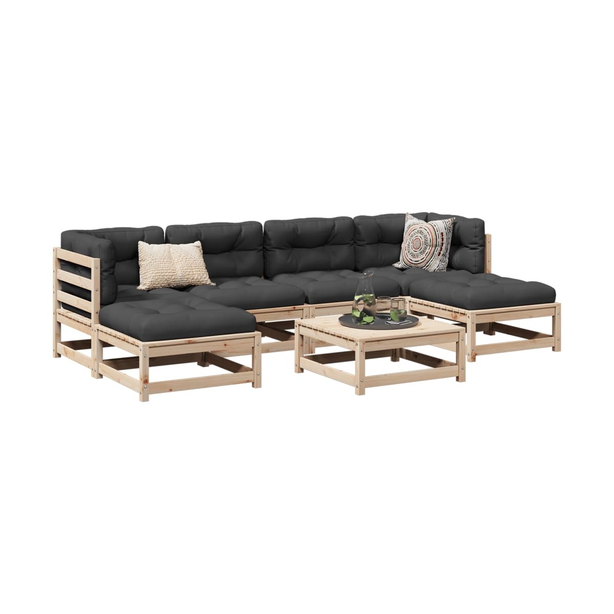 Este conjunto de sofás de jardín es el complemento perfecto para el jardín, terraza o patio, ya que proporciona un espacio confortable y acogedor para charlar con familiares y amigos o simplemente relajarte y disfrutar del aire libre. Material resistente y duradero: La madera maciza de pino es conocida por su resistencia y durabilidad. Sus vetas rectas y nudos característicos contribuyen a su encanto rústico. Experiencia de asiento cómoda: Estos muebles de exterior, completos con cojines acolchados gruesos, ofrecen una experiencia de asiento cómoda. Buena ventilación y prevención de encharcamientos: El diseño de rejilla favorece un flujo de aire óptimo y evita eficazmente la acumulación de agua, lo que garantiza un asiento seco y cómodo. Diseño modular: Este conjunto de muebles de exterior tiene un diseño modular, por lo que es completamente flexible y fácil de mover, para que puedas crear una disposición de muebles de exterior personalizada. Información útil:Para asegurarte de que tus muebles de exterior se mantengan hermosos, recomendamos protegerlos con una funda impermeable.