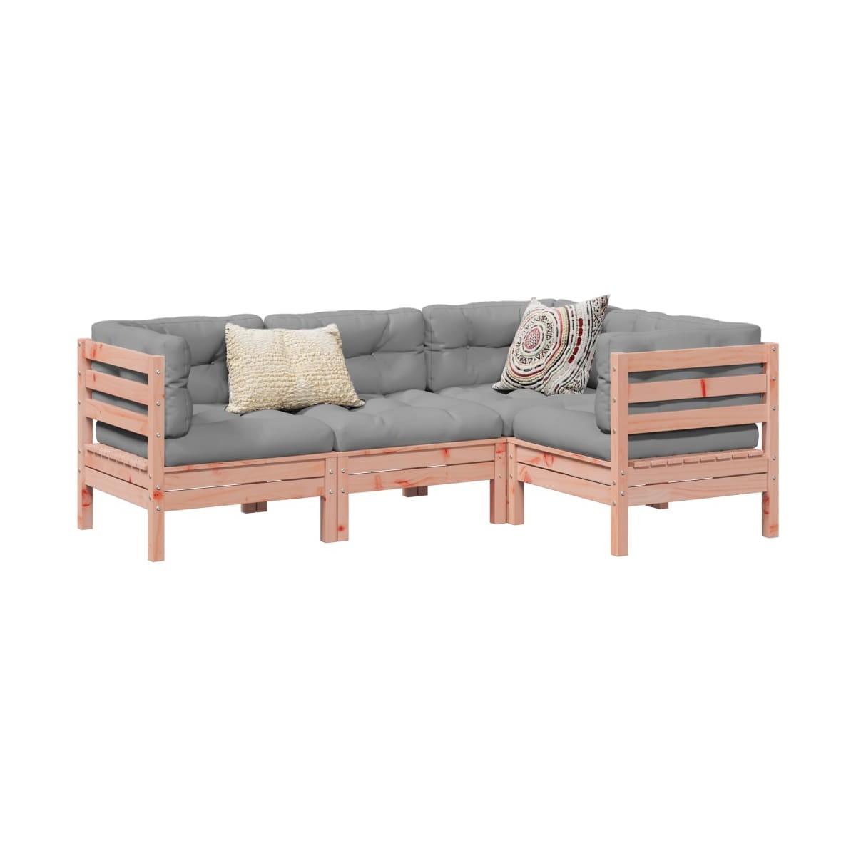 Este conjunto de sofás de jardín es el complemento perfecto para el jardín, terraza o patio, ya que proporciona un espacio confortable y acogedor para charlar con familiares y amigos o simplemente relajarte y disfrutar del aire libre. Material resistente y duradero: La madera de abeto Douglas es conocida por su resistencia y durabilidad. Su intenso color marrón rojizo y su veteado único transmiten un ambiente cálido y natural. Con una buena estabilidad y resistencia a la intemperie, es ideal para fabricar muebles de interior y exterior.Experiencia de asiento cómoda: Estos muebles de exterior, completos con cojines acolchados gruesos, ofrecen una experiencia de asiento cómoda.Buena ventilación y prevención de encharcamientos: El diseño de rejilla favorece un flujo de aire óptimo y evita eficazmente la acumulación de agua, lo que garantiza un asiento seco y cómodo.Diseño modular: Este conjunto de muebles de exterior tiene un diseño modular, por lo que es completamente flexible y fácil de mover, para que puedas crear una disposición de muebles de exterior personalizada. Información útil:Para asegurarte de que tus muebles de exterior se mantengan hermosos, recomendamos protegerlos con una funda impermeable.