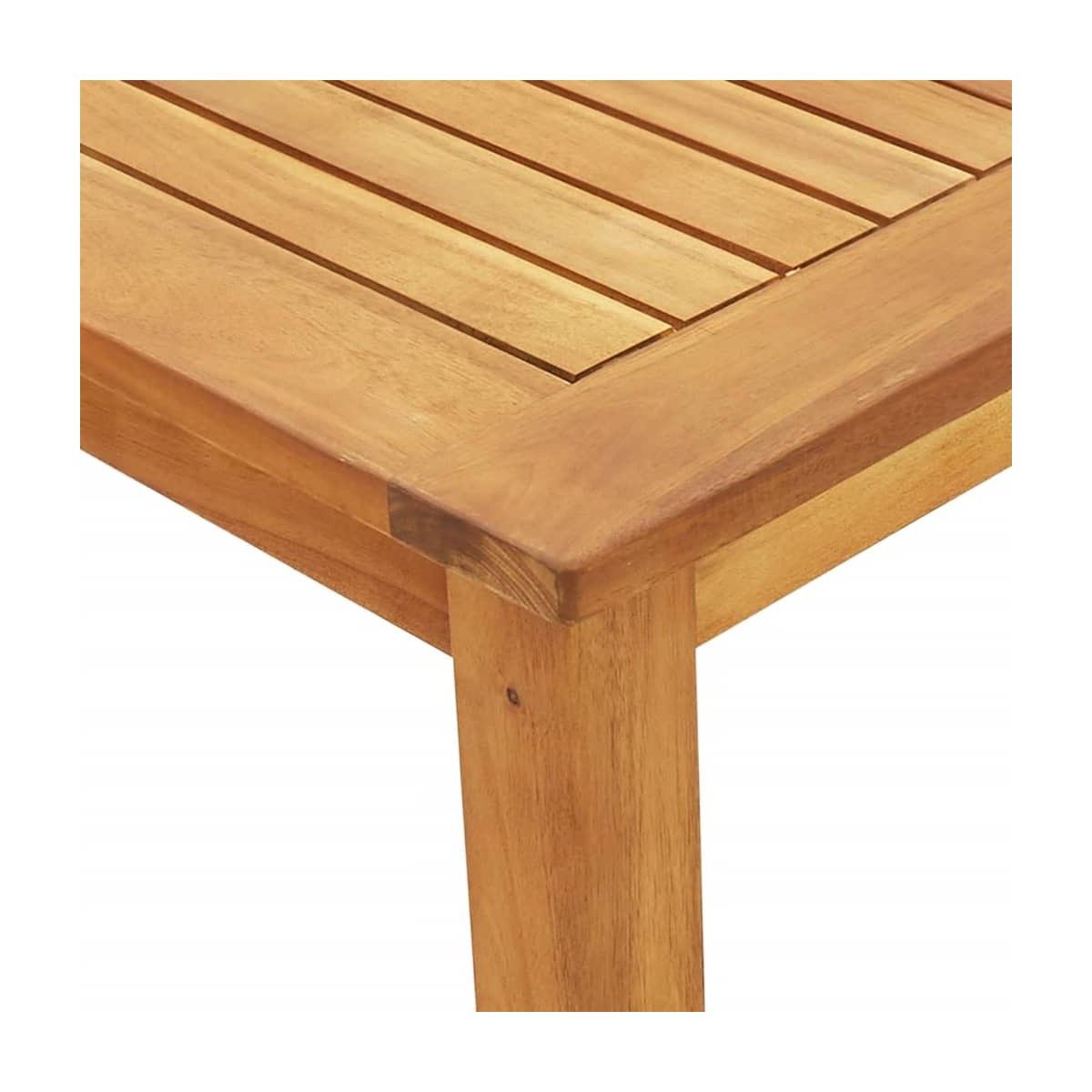 Este juego de comedor de jardín de madera es una excelente opción para cenar al aire libre o simplemente relajarse en el jardín, el patio o la terraza. Material de primera calidad: La madera maciza de acacia es un bonito material natural. La madera de acacia es una madera dura tropical, densa, robusta y duradera.Función plegable: Las sillas de comedor al aire libre se pueden plegar para ahorrar espacio cuando no se use.Ventilado: Este juego de comedor para patio con un diseño de listones puede permitir el flujo de agua, que no se pudre fácilmente y tiene una larga vida útil.Superficie estable: La superficie estable de la mesa de comedor es ideal para colocar tu bebida o cualquier otra necesidad que necesites a mano.Superficie fácil de limpiar: La superficie con acabado de aceite hace que este mueble de comedor de jardín sea fácil de limpiar con un paño húmedo. Información útil:Para asegurarte de que tus muebles de exterior se mantengan hermosos, recomendamos protegerlos con una funda impermeable.