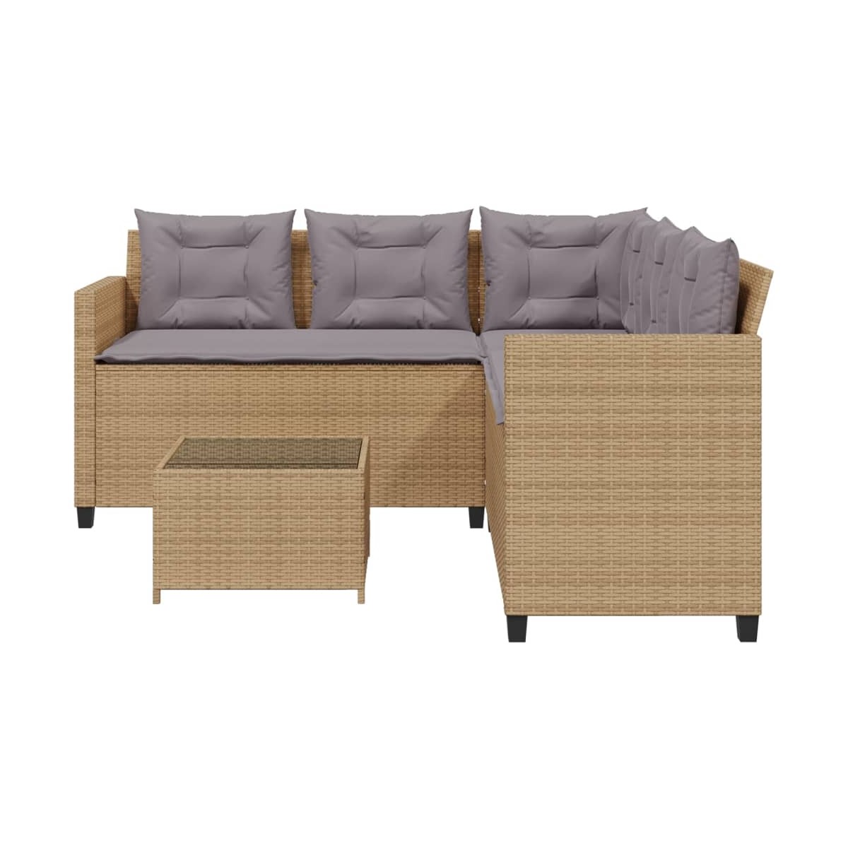 Este sofá de jardín en forma de L es el complemento perfecto para tu jardín, terraza o patio, ya que proporciona un espacio cómodo y acogedor para charlar con familiares y amigos o simplemente relajarse y disfrutar del aire libre. Material duradero: El ratán PE, también conocido como ratán sintético, es un material sintético resistente y de bajo mantenimiento que se parece al ratán natural. Es ligero, fácil de limpiar y se usa comúnmente para muebles de exterior debido a su durabilidad y propiedades resistentes a la intemperie.Experiencia de asiento cómoda: Estos muebles de exterior, completos con cojines acolchados gruesos, ofrecen una experiencia de asiento cómoda.Superficie de vidrio: La superficie de la mesa de exterior es de vidrio templado resistente y duradero, por lo que es fácil de limpiar con un paño húmedo y añade un toque de elegancia a tu espacio exterior.Funda desenfundable y lavable: Estos cojines de asiento cuentan con fundas desenfundables para facilitar el lavado y mantenimiento.Estructura robusta y estable: La estructura de acero con recubrimiento en polvo garantiza que el mueble de jardín sea resistente y estable para usarlo a diario al aire libre. Información útil:Para asegurarte de que tus muebles de exterior se mantengan hermosos, recomendamos protegerlos con una funda impermeable.
