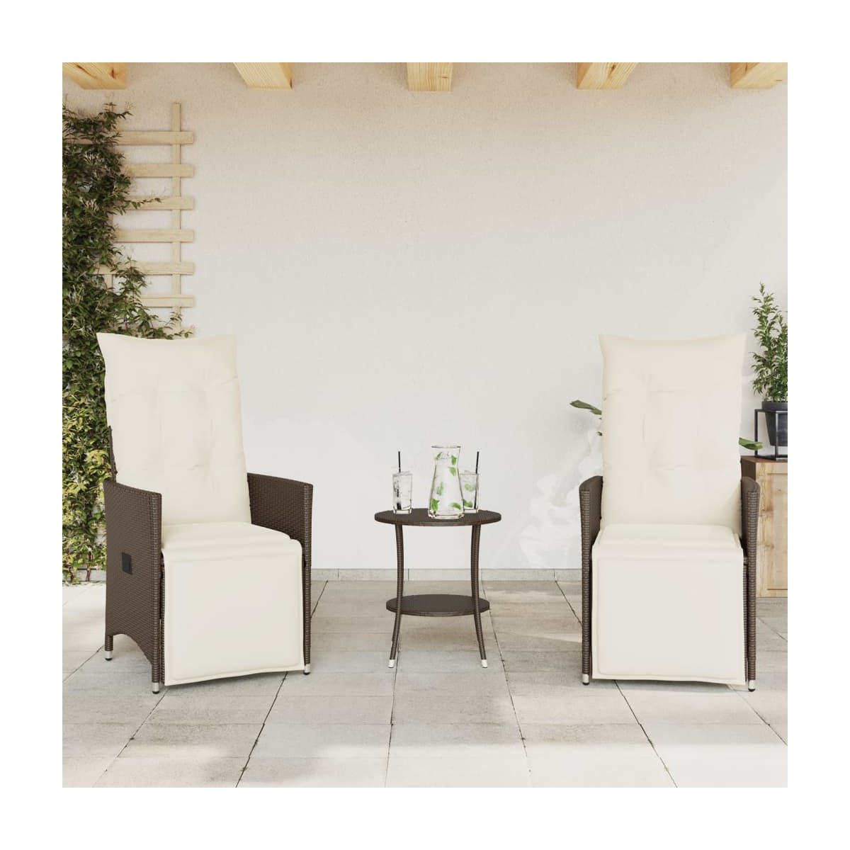 ¡Disfruta de un café o charla con tu familia y amigos en el jardín, patio trasero o balcón con este cómodo juego de bistró! Material duradero: El ratán PE, también conocido como ratán sintético, es un material sintético resistente y de bajo mantenimiento que se parece al ratán natural. Es ligero, fácil de limpiar y se usa comúnmente para muebles de exterior debido a su durabilidad y propiedades resistentes a la intemperie.Respaldo y reposapiés ajustables: este asiento de jardín tiene un asa. Puedes ajustar el respaldo y el reposapiés a cualquier posición tirando del asa. También puedes volver rápidamente a colocar el respaldo y el reposapiés en su posición original con el asa.Experiencia de asiento cómoda: Este juego de muebles de exterior, completo con cojines acolchados gruesos, ofrece una experiencia de asiento cómoda.Funda desenfundable y lavable: Estos cojines de asiento cuentan con fundas desenfundables para facilitar el lavado y mantenimiento. Los cojines del respaldo tienen una solapa en la parte posterior para facilitar la fijación a los respaldos.Estructura robusta y estable: La estructura de acero con recubrimiento en polvo garantiza que el mueble de jardín sea resistente y estable para usarlo a diario al aire libre. Información útil:Para asegurarte de que tus muebles de exterior se mantengan hermosos, recomendamos protegerlos con una funda impermeable.