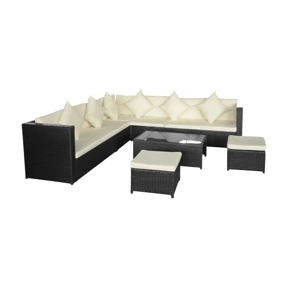 Este set de sofás de ratán, elegante y muy cómodo, se convertirá en el centro de atención de su jardín o patio. Gracias al ratán PE resistente a la intemperie, el juego de sofás es fácil de limpiar y resistente y adecuado para el uso diario. El sofá cuenta con una robusta estructura de acero con recubrimiento en polvo, que es muy duradera. Los cojines extraíbles del asiento y del respaldo son muy cómodos. Las fundas de poliéster son suaves y fáciles de limpiar. El juego de sofás de ratán se puede mover fácilmente para adaptarse a cualquier entorno. La entrega incluye dos sofás de 2 plazas, 2 sofás sin reposabrazos, 1 sofá esquinero, 2 reposapiés, 1 mesa de centro, 8 cojines de respaldo, 7 cojines de asiento y 6 almohadas.Nota: Recomendamos cubrir el set bajo la lluvia, la nieve y las heladas.