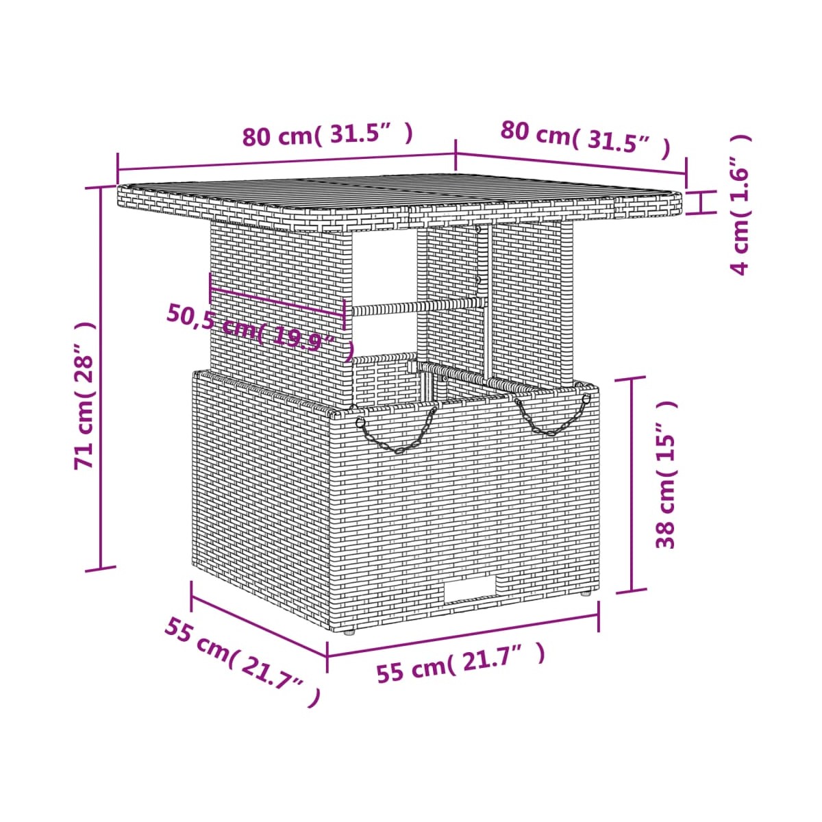 - Material: Ratán PE, acero con recubrimiento en polvo, madera maciza de acacia con acabado de aceite