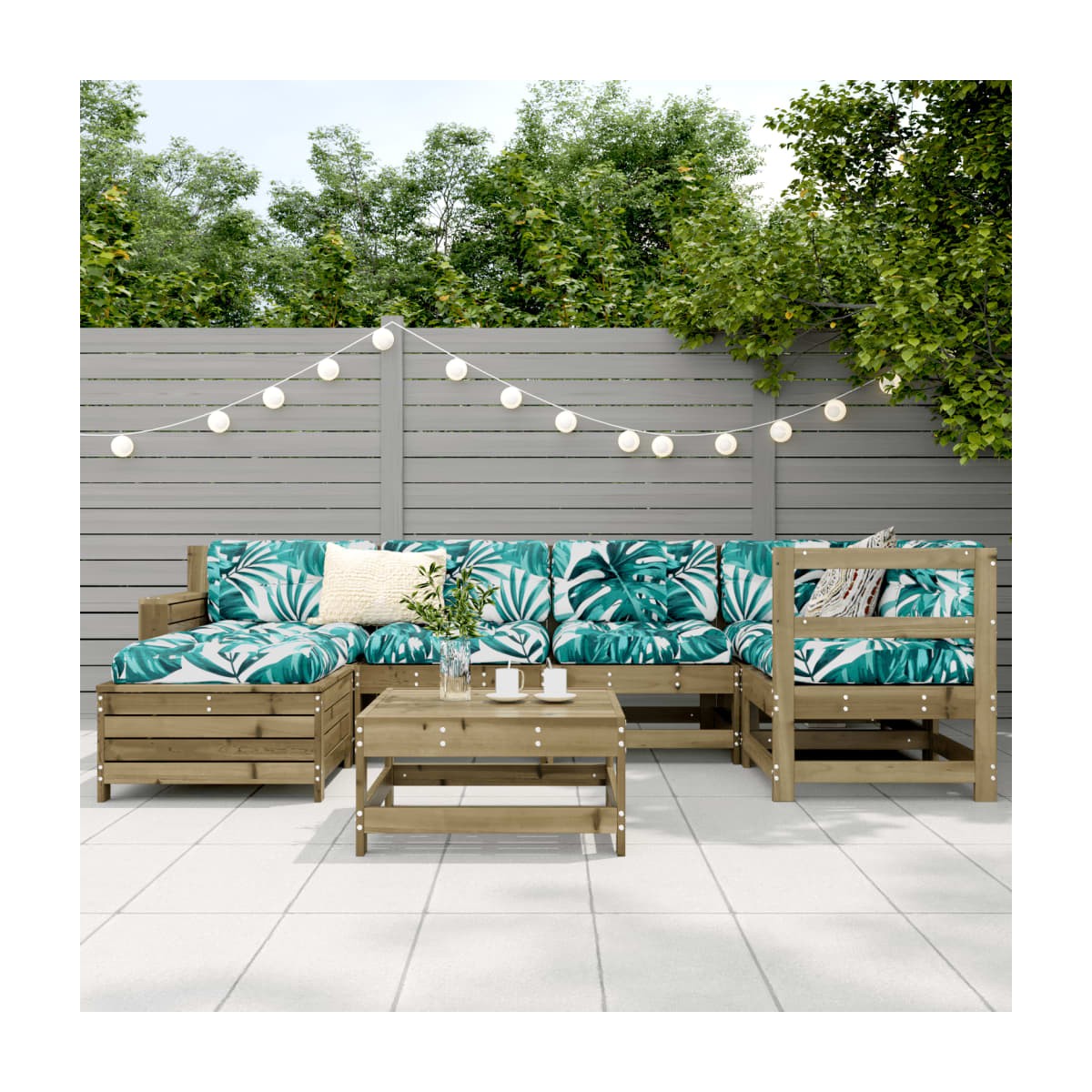 Este juego de sofás de jardín de madera, con un diseño de listones, será un gran complemento para el jardín, el patio o la terraza, para poder disfrutar de un rato agradable con la familia o los amigos. Material resistente y duradero: La madera maciza de pino es conocida por su resistencia y durabilidad. Sus vetas rectas y nudos característicos contribuyen a su encanto rústico. Se ha impregnado con una solución conservante y se ha sometido a un tratamiento en autoclave, lo que ha mejorado su resistencia al deterioro y a la intemperie. Buena ventilación y prevención de encharcamientos: El diseño de rejilla favorece un flujo de aire óptimo y evita eficazmente la acumulación de agua, lo que garantiza un asiento seco y cómodo. Uso versátil: El taburete de jardín no solo se puede usar para sentarse o relajar los pies, sino que también se puede usar como mesa de centro para guardar bebidas, comida y otros adornos. Cómoda mesa auxiliar: Este mueble de exterior cuenta con una mesa auxiliar plegable con un muelle de gas en el reposabrazos, lo que proporciona un lugar práctico para mantener tus elementos esenciales al alcance de la mano. Diseño modular: Este conjunto de muebles de exterior tiene un diseño modular, por lo que es completamente flexible y fácil de mover, para que puedas crear una disposición de muebles de exterior personalizada. Información útil:Para asegurarte de que tus muebles de exterior se mantengan hermosos, recomendamos protegerlos con una funda impermeable.