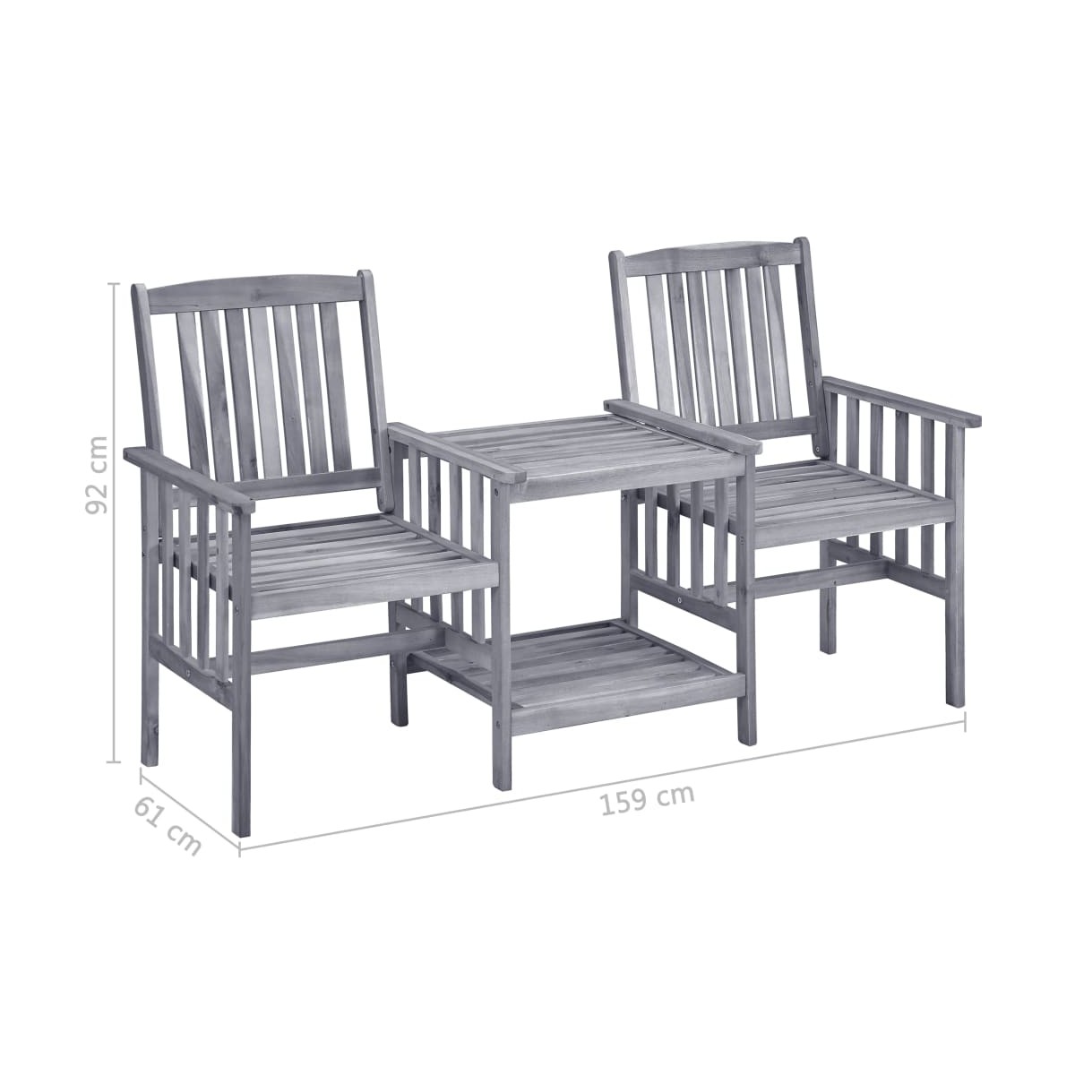 Disfruta de una maravillosa hora del café con estas rústicas sillas de jardín de madera con mesita. Serán un aporte verdaderamente fácil de usar y llamativo para tu jardín y patio. La mesa y las sillas están hechas de madera de acacia maciza, lo que las hace sumamente estables y robustas. La superficie robusta y el estante inferior son ideales para guardar tazas, libros y otros artículos pequeños. Y los respaldos y reposabrazos de las sillas garantizan una experiencia de descanso relajante. Además, los cojines añaden un extra de comodidad. Cada cojín cuenta con dos juegos de cuerdas para fijarlo firmemente al juego de bistró. Nota: Para prolongar la vida útil de los muebles de exterior, te recomendamos que los limpies con regularidad y no los dejes al aire libre sin protección innecesariamente.Limpieza: Usa una solución de jabón suaveAlmacenamiento: Si es posible, guarda el producto en un lugar fresco y seco en el interior. Si el producto se almacena al aire libre, protégelo con una funda impermeable. Limpia y seca el exceso de agua o nieve de las superficies planas después de una lluvia o nevada. Permite la ventilación para evitar daños relacionados con la humedad.