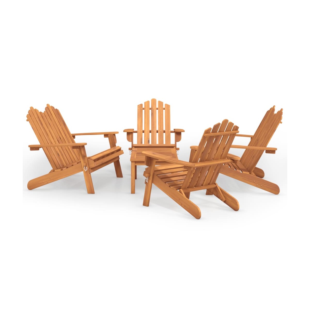 Disfruta de tu tiempo libre con este juego de muebles de jardín de madera con diseño Adirondack. Madera maciza de acacia: Este juego de muebles está hecho de madera maciza de acacia. La madera maciza de acacia es un bonito material natural. La madera de acacia es una madera dura tropical, densa, robusta y duradera.Cómodo asiento: El respaldo alto y ligeramente inclinado y los anchos reposabrazos te permiten sentarte cómodamente y relajarte.Mesa práctica: La mesa de centro es perfecta para colocar bebidas, comida y artículos decorativos.Diseño plegable: La silla y el banco Adirondack se pueden plegar fácilmente cuando no se utilicen, para facilitar su almacenamiento y transporte. Información útil:Para facilitar al máximo el montaje, cada producto se entrega con un manual. Nota:Para asegurarte de que tus muebles de exterior se mantengan hermosos, recomendamos protegerlos con una funda impermeable.