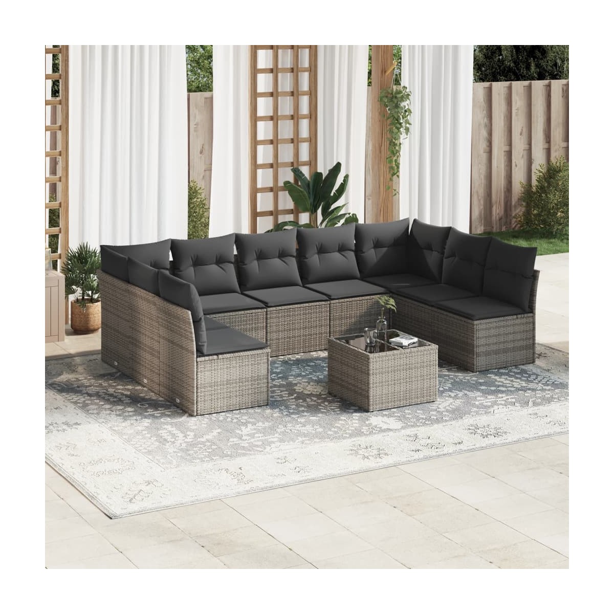 Este conjunto de sofás de jardín es el complemento perfecto para el jardín, terraza o patio, ya que proporciona un espacio confortable y acogedor para charlar con familiares y amigos o simplemente relajarte y disfrutar del aire libre. Material duradero: El ratán de PE, también conocido como ratán sintético, es un material sintético resistente y de bajo mantenimiento que se parece al ratán natural. Es ligero, fácil de limpiar y se usa comúnmente para muebles de exterior debido a su durabilidad y propiedades resistentes a la intemperie.Función de almacenaje con bolsa impermeable: Cada asiento de jardín cuenta con espacio de almacenamiento debajo del asiento, completo con una bolsa resistente al agua para guardar cojines, juguetes y otros artículos. Las bolsas interiores tienen una cubierta superior y pueden fijarse firmemente a los asientos con cierres adhesivos para mayor estabilidad.Superficie de vidrio: La superficie de la mesa de exterior es de vidrio templado resistente y duradero, por lo que es fácil de limpiar con un paño húmedo y añade un toque de elegancia a tu espacio exterior.Funda desenfundable y lavable: Estos cojines de asiento cuentan con fundas desenfundables para facilitar el lavado y mantenimiento.Diseño modular: Este conjunto de muebles de exterior tiene un diseño modular, por lo que es completamente flexible y fácil de mover, para que puedas crear una disposición de muebles de exterior personalizada. Información útil:Para asegurarte de que tus muebles de exterior se mantengan hermosos, recomendamos protegerlos con una funda impermeable.