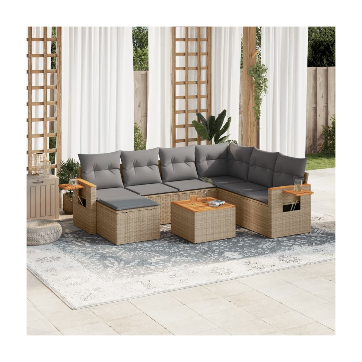 Este conjunto de sofás de jardín es el complemento perfecto para el jardín, terraza o patio, ya que proporciona un espacio confortable y acogedor para charlar con familiares y amigos o simplemente relajarte y disfrutar del aire libre. Material duradero: El ratán PE, también conocido como ratán sintético, es un material sintético resistente y de bajo mantenimiento que se parece al ratán natural. Es ligero, fácil de limpiar y se usa comúnmente para muebles de exterior debido a su durabilidad y propiedades resistentes a la intemperie.Función de almacenamiento con bolsa resistente al agua: El mueble de jardín cuenta con espacio de almacenamiento debajo del asiento, completo con una bolsa resistente al agua para guardar cojines, juguetes y otros artículos. La bolsa interior se puede sujetar de forma segura a los muebles de exterior con cierres de gancho y bucle para mayor estabilidad.Cómoda mesa auxiliar: Este mueble de exterior cuenta con una mesa auxiliar plegable con un resorte de gas en los reposabrazos, lo que proporciona un lugar conveniente para mantener tus elementos esenciales al alcance de la mano.Funda desenfundable y lavable: Estos cojines de asiento cuentan con fundas desenfundables para facilitar el lavado y mantenimiento.Diseño modular: Este conjunto de muebles de exterior tiene un diseño modular, por lo que es completamente flexible y fácil de mover, para que puedas crear una disposición de muebles de exterior personalizada. Información útil:Para asegurarte de que tus muebles de exterior se mantengan hermosos, recomendamos protegerlos con una funda impermeable.