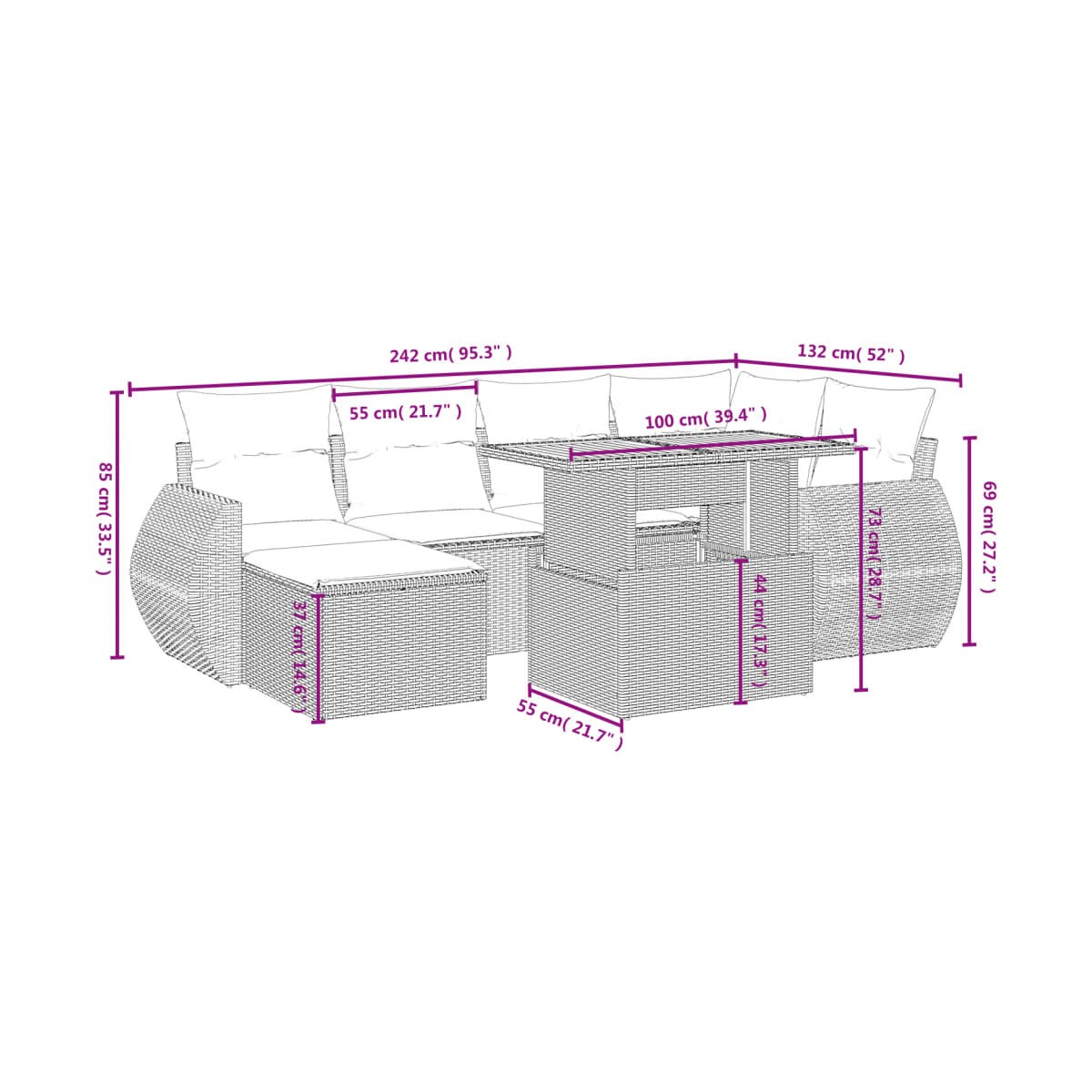Este conjunto de sofás de jardín es el complemento perfecto para el jardín, terraza o patio, ya que proporciona un espacio confortable y acogedor para charlar con familiares y amigos o simplemente relajarte y disfrutar del aire libre. Material duradero: El ratán PE, también conocido como ratán sintético, es un material sintético resistente y de bajo mantenimiento que se parece al ratán natural. Es ligero, fácil de limpiar y se usa comúnmente para muebles de exterior debido a su durabilidad y propiedades resistentes a la intemperie.Tablero ajustable: El tablero de la mesa se puede levantar para que la mesa sea más alta, lo que transforma la mesa de jardín de una mesa de centro a una mesa de comedor. Es perfecta para invitar a invitados o comer al aire libre.Funda desenfundable y lavable: Estos cojines de asiento cuentan con fundas desenfundables para facilitar el lavado y mantenimiento.Diseño modular: Este conjunto de muebles de exterior tiene un diseño modular, por lo que es completamente flexible y fácil de mover, para que puedas crear una disposición de muebles de exterior personalizada. Información útil:Para asegurarte de que tus muebles de exterior se mantengan hermosos, recomendamos protegerlos con una funda impermeable.