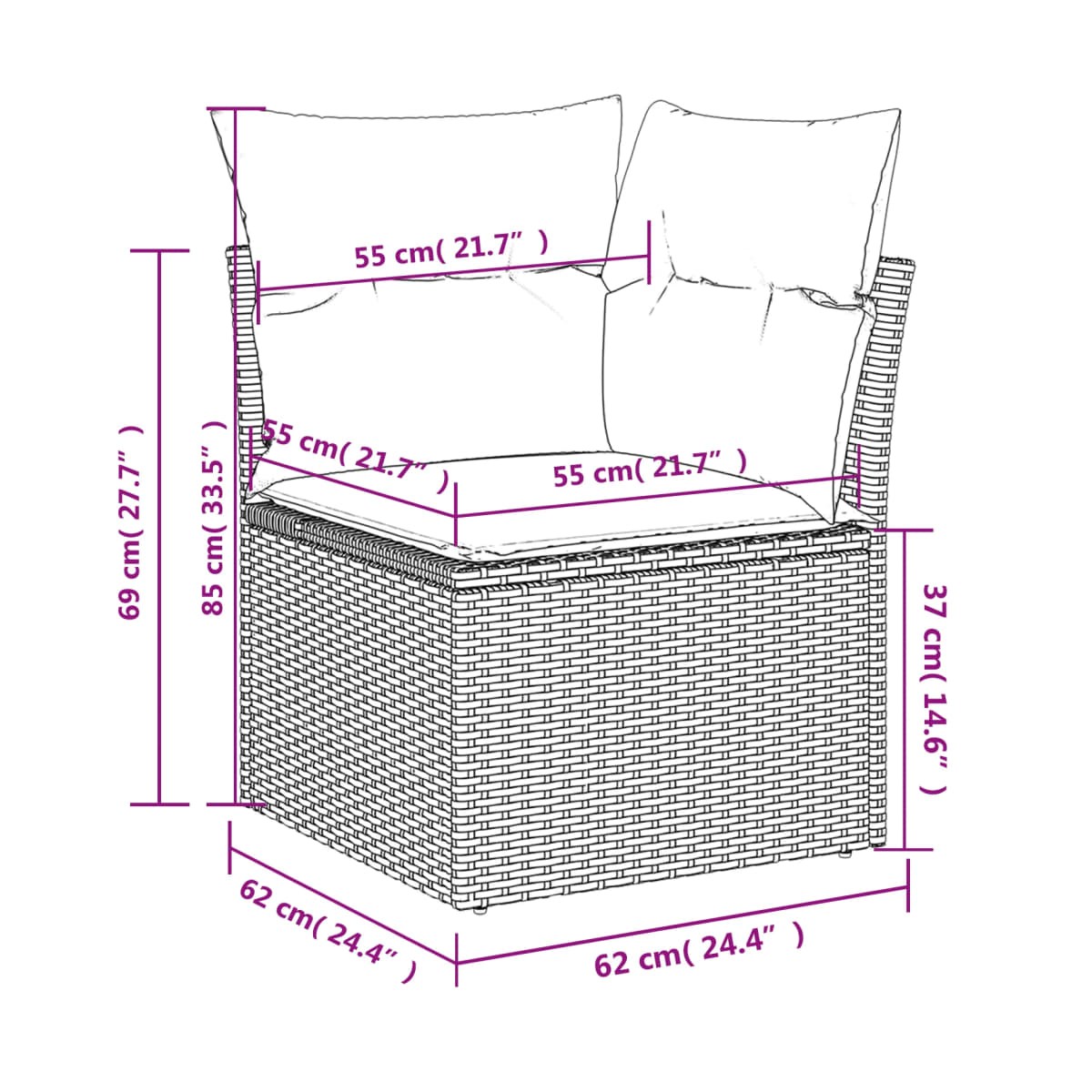 - Dimensiones: 55 x 55 x 37 cm (largo x ancho x alto)