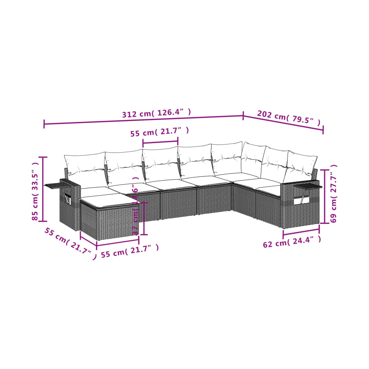 - Dimensiones del cojín de asiento: 55 x 55 x 3 cm (ancho x profundo x grosor)